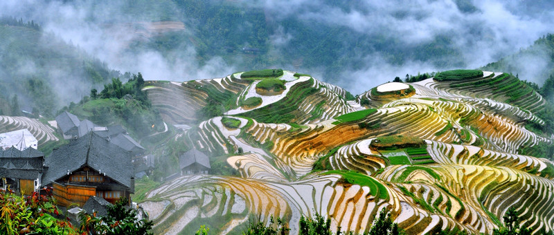 梯田處處有,可像龍脊梯田這樣大規(guī)模的集中實屬罕見。從流水湍急的河谷,到白云繚繞的山巔,從萬木蔥蘢的林邊到石壁陡崖前,凡有泥土的地方,都開辟了梯田。垂直高度達(dá)五六里,橫向伸延五六里,那起伏的和高聳入云的山,蜿蜓的如同一級級登上藍(lán)天的天梯,像天與地之間一幅幅巨大的抽象畫……每位看見這一景色的游客,心靈也都會被深深地震撼!