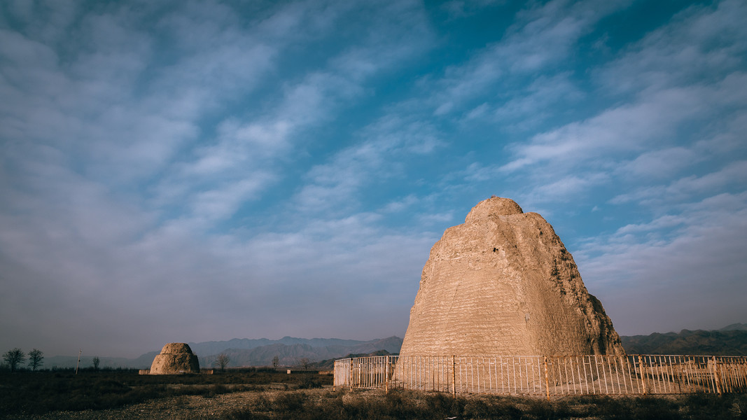 遠(yuǎn)處雄偉的賀蘭山脈,一望無垠的黃色王陵建筑,廣袤的藍(lán)天白云,置身于此,體會(huì)古老神秘的西夏王國。
