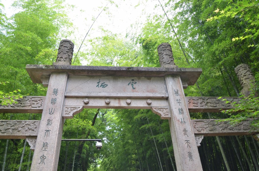 竹徑入口有碑亭一座,上有陳云同志題寫的“云棲竹徑”四字。從亭邊的碑文看,此亭最早建于明代,亭柱上的有清人陳燦“客到洗心亭子坐,頓教塵慮一時(shí)湔”、“萬(wàn)竿綠竹影參天,幾曲山溪咽細(xì)泉”的詩(shī)句。