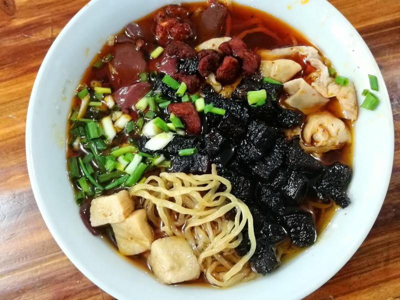 腸旺面的標(biāo)配有肥腸(腸),豬血(旺),還有比較勁道的不會粘連的堿水面。除開這幾樣,還可以加配料,最常見的是脆哨,有點(diǎn)像南方人說的豬油渣,相對的還有“軟哨”。