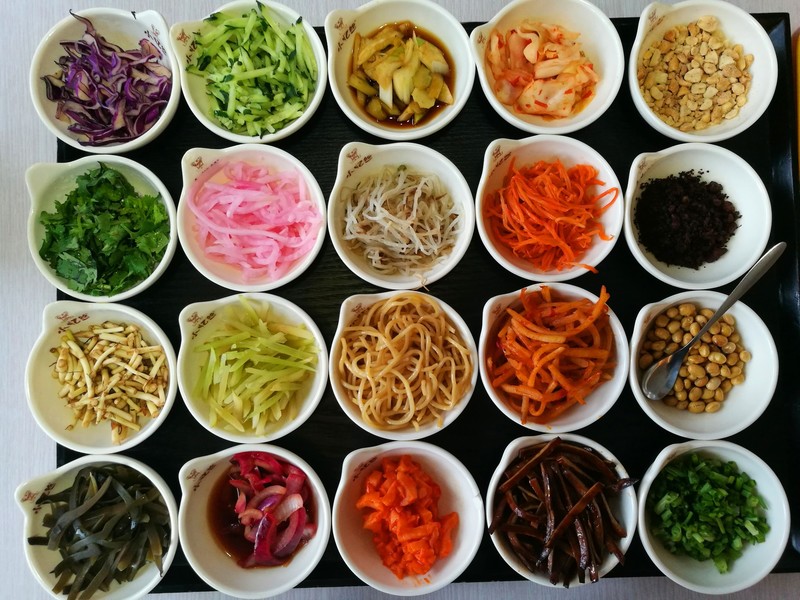 一份餅有10張,一桌子五顏六色的小菜足有20種。蘸水可以選擇原味(醬油和醋)或酸湯,桌上的調(diào)料還有辣椒和木姜子油。