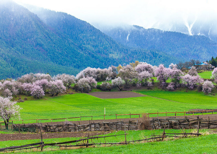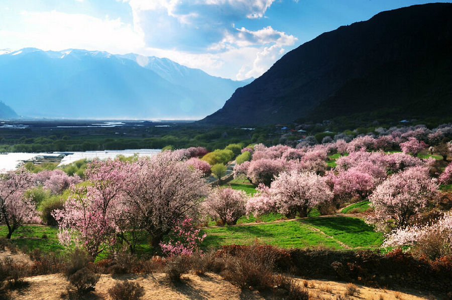 3、4月的林芝是花的海洋,遠(yuǎn)方的雪峰還有皚皚白雪,桃花已如醉霞緋云般地爭(zhēng)相斗艷。粉嫩的桃花,雪白的梨花在氣勢(shì)磅薄的雪山懷抱中無限柔媚。