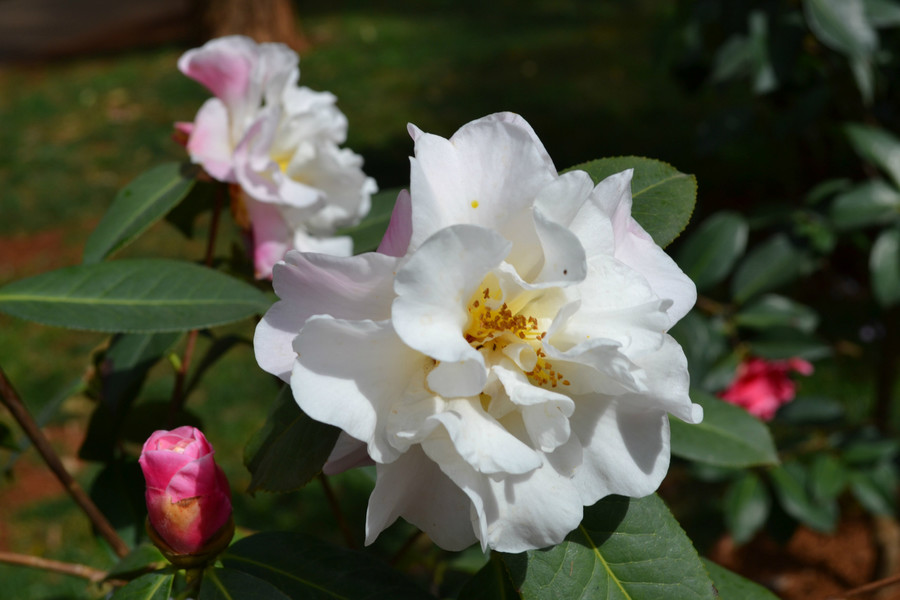 湖心島上,有天然生長的香樟樹。而湖邊,傲雪、金盤荔枝、九曲等20多個品種的茶花開放時的美景,也是令人陶醉。