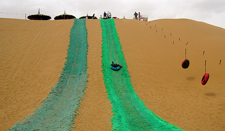 在沙坡頭,滑沙是一定要體驗(yàn)的娛樂項(xiàng)目之一。游人從高約百米的沙坡頭的坡頂往下俯沖,由于特殊的地理環(huán)境和地質(zhì)結(jié)構(gòu),滑沙時會發(fā)出一種奇特的響聲,如洪鐘巨鼓,沉悶渾厚,稱之為“金沙鳴鐘”。