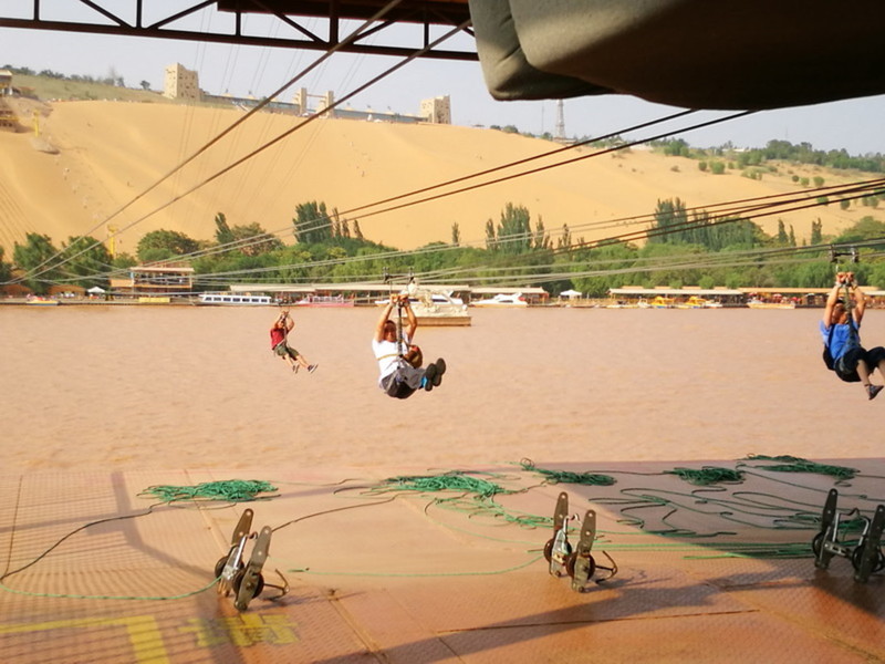 在沙坡頭,感受古老的羊皮筏子后,還可以用最快的方式飛渡黃河,那就是前往“飛黃騰達(dá)”黃河索道站點(diǎn),在這里可以坐著飛索飛越黃河。飛到黃河上空時,可以俯瞰整個黃河美景,同時又非常的刺激。這種飛越黃河的方式只有在這里才能玩得到。