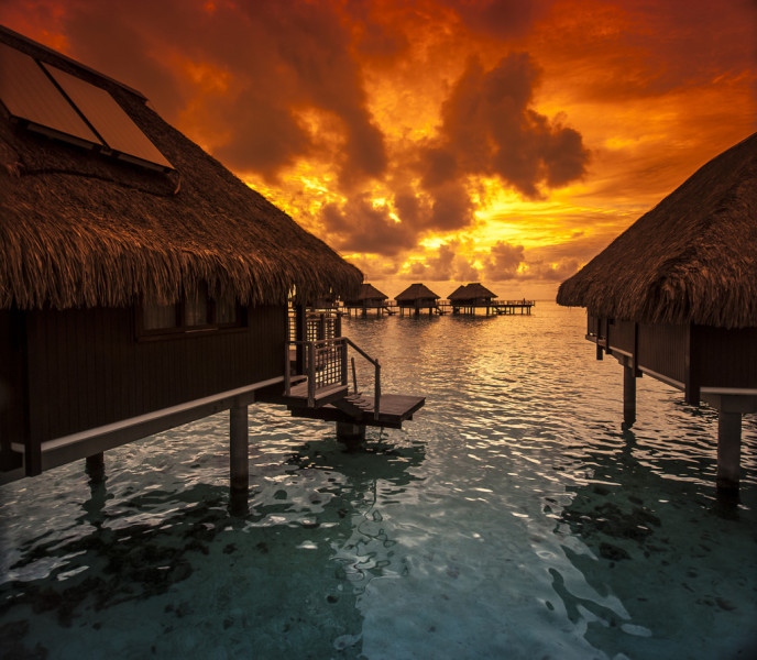 在水屋直面波拉波拉島湛藍的海洋,透過地板的玻璃窗,可見魚兒在水中曼舞,從水上屋直接跳進海里,自由自在的與魚群一同暢游。夜間海水輕拍水屋,在這樣恬淡的氛圍里悠然入夢;最浪漫的體驗莫過于清晨醒來,一艘滿載水果食物的獨木舟??吭谒葸?,乘著小舟在海面上品嘗美食。