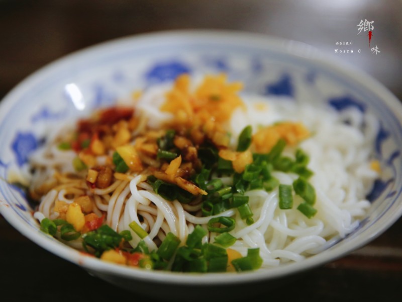 米線用米制成,長條狀,截面為圓形,色潔白,有韌性,于開水中稍煮后撈出,放入肉湯中,一般拌入蔥花、醬油、鹽、味精、油辣、肉醬,趁熱吃。粉絲與其類似,但口感不同。