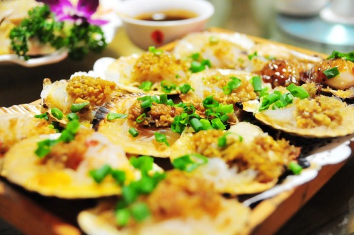 五彩雪花扇貝,這道菜是大連名菜中少數(shù)屬于東北菜系的菜式。這道菜質(zhì)地很嫩,五彩雪花扇貝中的雪花是用蛋清炒成,加入扇貝肉,放粉絲,紅椒丁和調(diào)味料,隔水蒸熟。再淋些明油。足足的海味質(zhì)嫩味鮮。