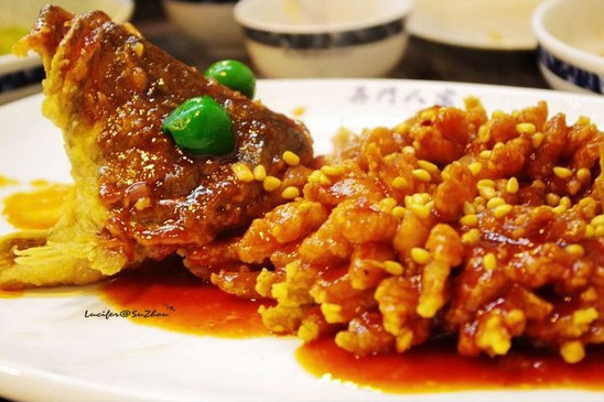 松鼠魚也是大連經(jīng)典的老菜之一。松鼠魚外形像松鼠,因此而得名。做這道菜,各地用的魚也有差別。在大連市是用黃花魚做主料,做法上魚炸兩次,第一次炸熟,第二次炸脆,再淋上糖醋汁,保持持久的酥脆度才酸甜好吃。
