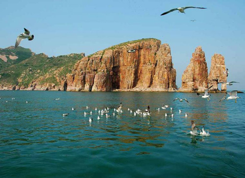 萬鳥島坐落于山東長島諸島中部偏東,這個海拔73.5米、僅有0.05平方公里的小島,在浩渺的汪洋大海之中,簡直是一粒微不足道的沙粒,然而海深魅力大,島小情趣多,因島上棲居著幾萬只黑尾鷗、海鸕鶿、白腰雨燕等海鳥,后稱萬鳥島。海岸地貌懸崖陡壁占90%以上,山東長島漁家樂 斷崖系石英巖與板巖互層,節(jié)理發(fā)育,破碎性強,經(jīng)千百年風化和海蝕,崖壁此凸彼凹,石階、石臺、石窟、石穴鱗次櫛比,形成一座自然的“海鷗石樓”。每年四、五月間,成千上萬只海鷗在此安家,覓食、嬉戲、休憩、生兒育女。