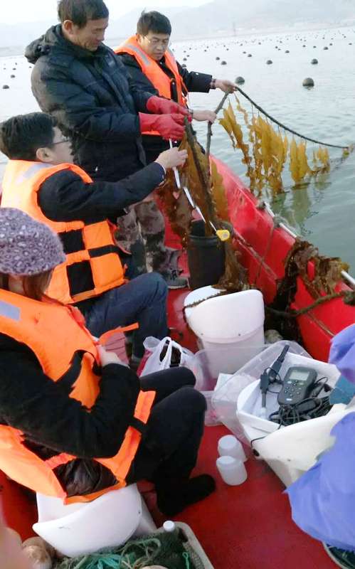 12月17日,山東省現(xiàn)代農(nóng)業(yè)產(chǎn)業(yè)技術(shù)體系藻類產(chǎn)業(yè)創(chuàng)新團(tuán)隊(duì)崗位專家孫利芹教授一行三人同山東長島縣水產(chǎn)研究所一行三人到大欽島鄉(xiāng)東村觀察近期引進(jìn)的海帶新品種生長情況。長島漁家樂通過測(cè)量比較,發(fā)現(xiàn)于上月完成夾苗的海益新品種現(xiàn)平均長到1.5m,黃官新品種由于夾苗晚于海益,現(xiàn)平均長到0.8m,總體長勢(shì)不錯(cuò)。