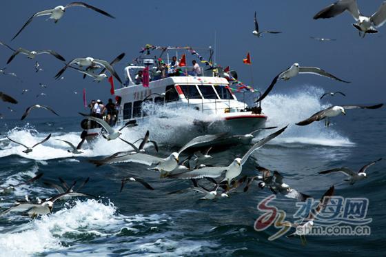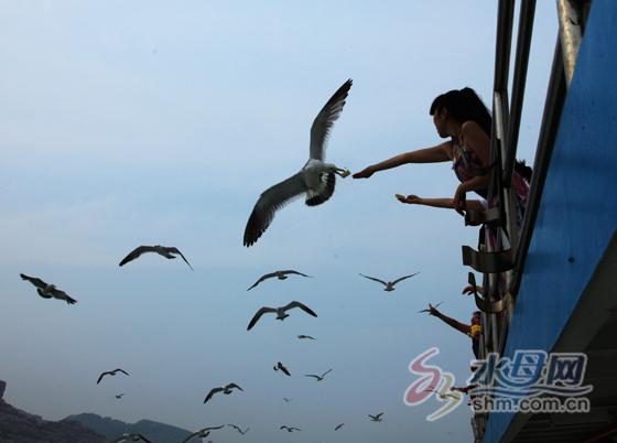 當游輪行駛到萬鳥島,成群的海鷗在霧蒙蒙的海面上飛舞著,游輪、海鷗、游客,海天一色,一幅美輪美奐的畫面就這樣形成了?!暗谝淮慰梢赃@樣近距離的喂食海鷗,非常非常開心?!庇慰完惻窟呂购zt邊說。伴隨著“鷗鷗”的叫聲,盤旋在游輪上空的海鷗也會調(diào)皮地來到游客身邊,跟隨者前行的游輪,長島漁家忽高忽低地舞動著翅膀。