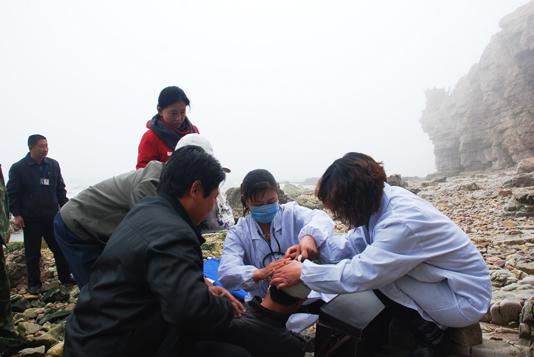 在九丈崖景區(qū),一位游客因意外“受傷”倒在景區(qū)礁石上,景區(qū)安全巡視員發(fā)現(xiàn)情況后,一邊向上級匯報,一邊通知景區(qū)兼職救護人員對游客進行緊急救助,在短短的2分鐘內(nèi),九丈崖景區(qū)立即啟動安全應急預案,安全應急小組成員、景區(qū)醫(yī)護人員對 “受傷”游客進行簡單包扎后,迅速抬到就近的停車場,攔截一輛出租車,緊急送往景區(qū)所在地鄉(xiāng)鎮(zhèn)醫(yī)院進行救治。不明真理的游客還真以為出現(xiàn)了安全事故。其實,這是長島九丈景區(qū)工作人員正在進行處理突發(fā)事件安全事故的救援演練。