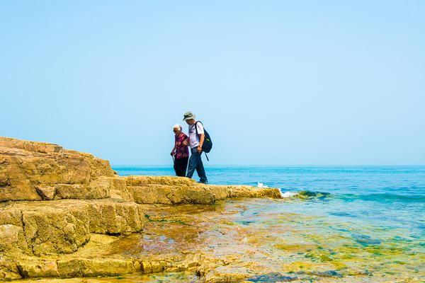 ↗ 一對(duì)母子在海邊的礁石上拍照。笑容綻放在老人那張布滿歲月痕跡的臉上,一雙滿是深褶的手拄著拐杖, 站得筆直。老人家已經(jīng)七十多了,卻是頭一回看到大海,兒子特意帶著老人從東北過來玩的。