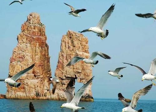 去萬鳥島必須出海坐船,船行時間往返需要半天,但沿途經廟島燒餅島,大小黑山島,寶塔礁、馬槍石、軍艦島高山島等眾多島嶼,風景非常獨特,一路不知不覺就過去了。建議帶點面包,餅干等食物,靠近萬鳥島時,扔給海鷗,會有成百上千只海鷗飛來爭食,場面非常壯觀(不要喂海鷗帶奶油或色素的食物,容易使它不消化)。