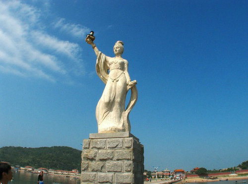 望福礁也叫望夫礁。位于南長島北端。景區(qū)內(nèi)有一人像形石礁,人稱望夫礁,遠遠望去,似一漁婦懷抱嬰兒,期盼著親人歸來。巧合的是此礁石位置與廟島顯應(yīng)宮幾乎同一緯度,島上人們認為是海神娘娘庇護海上行船,巡游至此,期盼福運,后來望夫礁又稱為媽祖望福礁,喻為迎福納祥之意。不過我更喜歡望夫礁的名字,多么形象,多么貼切,又是多么傷感很浪漫。只是我不知道,她是否等到了出海打漁的丈夫,而我來到這,并不是那個要等的人。此外這里還被認作是神話中“?!?、 “祿”、“壽”三星在蓬萊的仙居之地,因此具有濃重的福文化特色。據(jù)領(lǐng)隊說,媽祖護海、八仙過海、精衛(wèi)填海、張羽煮海四大傳說也定位于這里,也更為這里增添了許多濃郁的神秘色彩。