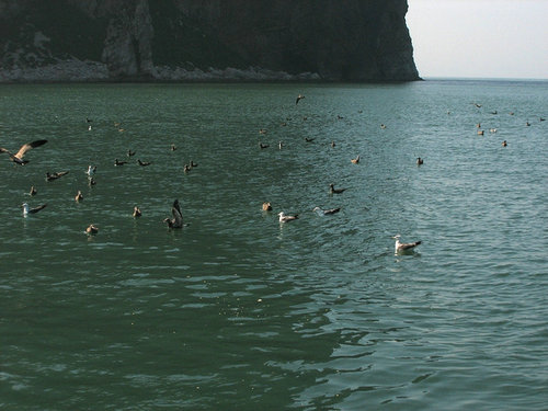 萬鳥島,遠遠望去,酷似一艘錨泊的登陸艦。全島海岸線長1.25公里,車由島環(huán)島無路,唯中部有一涵洞可至山腰,人稱“通天路”,極其險峻。但勇攀而上, 可領(lǐng)略無限風(fēng)光。走在通天路上,宛如置身于海鷗的王國,隨手可以觸及到鳥兒的羽翼;美妙的鷗鳥之曲悠揚不息。登上山頂,密密扎扎的鷗鳥圍著你上下翻飛,您 可以隨心所欲地欣賞這絕世的“鷗鳥百態(tài)圖”。乘船臨島,仰望巖壁,鷗影綽約,鳥聲盈耳,幾萬只海鷗與常住這里的黑尾鷗、白腰雨燕、海鸕鶿、扁嘴海雀構(gòu)成千羽萬翼之下,成為鳥的天,鳥的海,鳥的島,景象頗為壯觀。海岸地貌懸崖陡壁占90%以上,斷崖系石英巖與板巖互層,節(jié)理發(fā)育,破碎性強,經(jīng)千百年 風(fēng)化和海蝕,崖壁此凸彼凹,石階、石臺、石窟、石穴鱗次櫛比,形成一座自然的“海鷗石樓”。每年四、五月間,成千上萬只海鷗在此安家,覓食、嬉戲、休憩、 生兒育女。這時的小島變成了喧囂的鳥國、沸騰的劇場、海鷗的天堂。