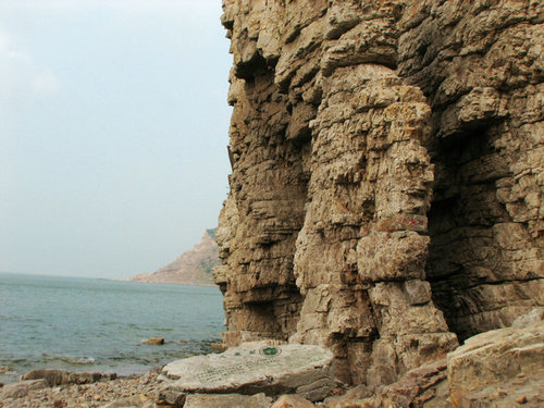 寶塔礁位于廟島犁犋把島北端, 寶塔礁因形似寶塔而得名,系由地層斷裂所塑,年久海蝕而成。它位于長島縣犁犋把島北端,寶塔礁由石英巖和頁巖交替疊壓而成,石紋清晰,層次分明,自上而下一條條橫繞的紋路將塔分成幾十層,裂隙豎垂的巖線,又將每一層次都割裂成數(shù)段,仿佛這塔并不是嚴密的整體,而是一個由大小不等、形狀不同的石塊堆砌而成的松散的建筑。在距滿潮水位約3米高的地方,寶塔又生出一圈環(huán)形的斷裂層,將整座塔身的1/3懸在空中,顯得格外雄奇。我這次光顧著照人了,沒有照到好的角度。