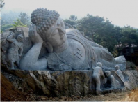 長樂臥佛是耐風(fēng)化青石整體巖雕刻而成,是全國獨有。長島漁家樂長樂臥佛雕刻工藝一流,耗時3年建成。長樂臥佛的姿勢為“吉祥臥”,佛的身后環(huán)立著12尊表情豐富佛祖的12大弟子石佛像,佛