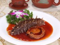 一條胖乎乎的黑亮大刺參臥在一汪晶瑩剔透的湯汁中,鮮艷飽滿的紅色枸杞綴在湯面上映襯著翠綠若波的油菜葉……鮮香濃郁的感官沖擊引誘著腹內(nèi)蠢蠢欲動的饞蟲。忍不住品一口,純凈水發(fā)制成的最完整的海參爽滑而細(xì)膩,鮮香而醇厚。吸盡盤中的湯汁,瞬間唇齒留香,回味頗無窮。