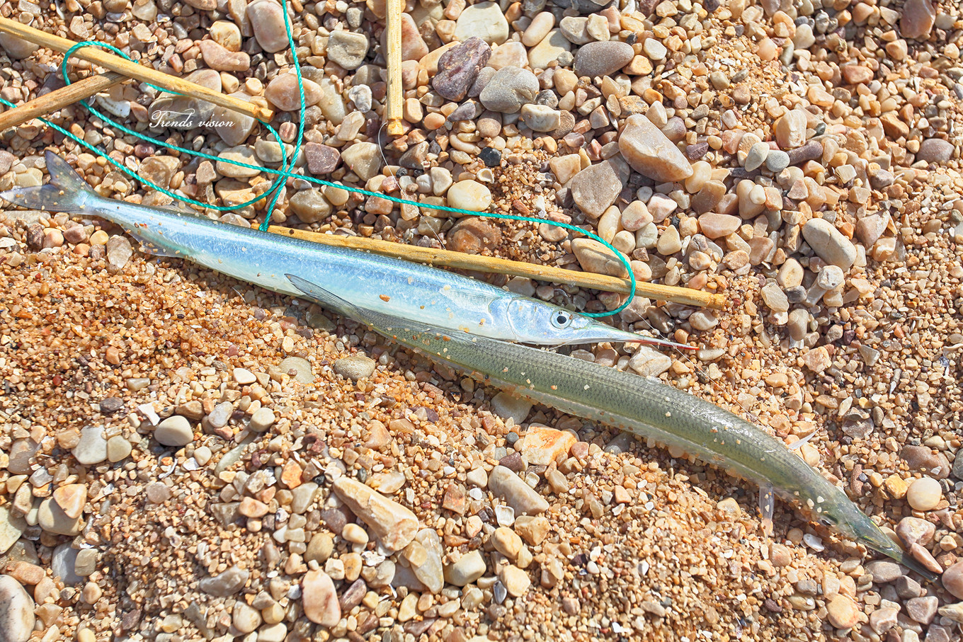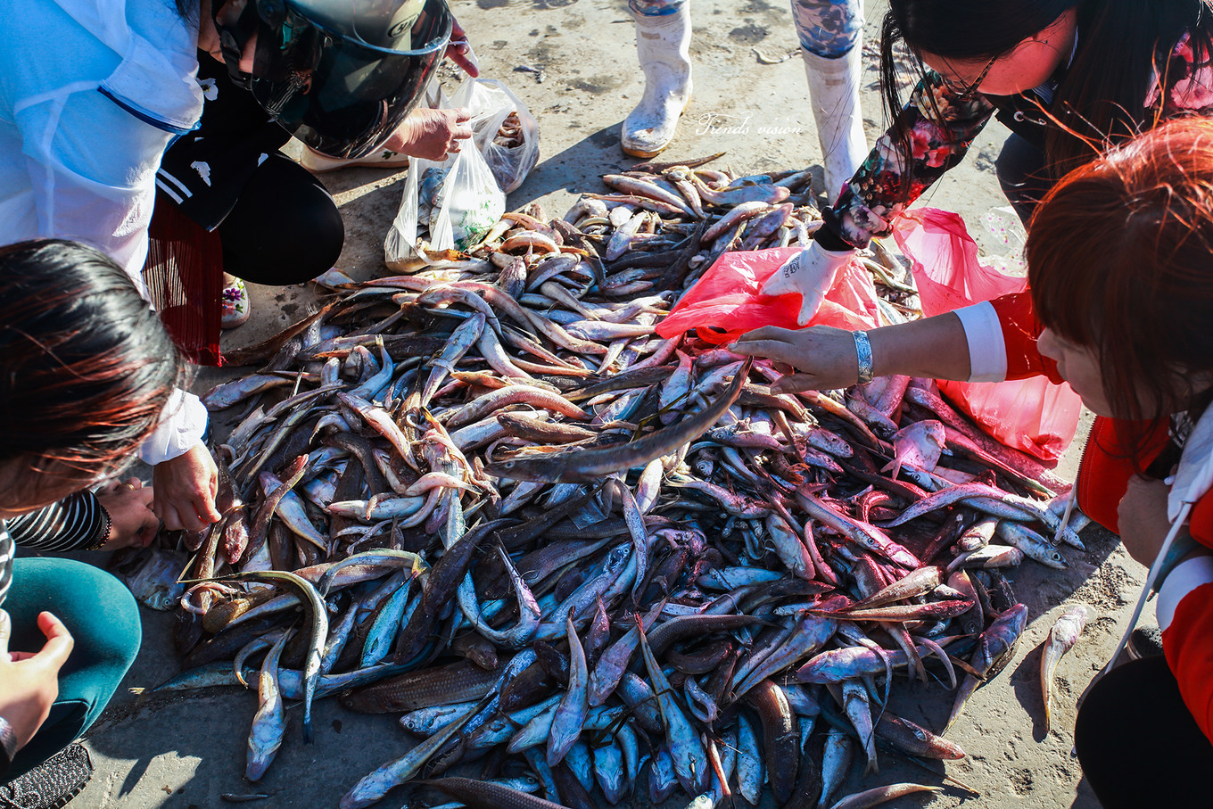 下圖魚繩收回滿滿的收獲,魚繩上掛滿了魚獲。