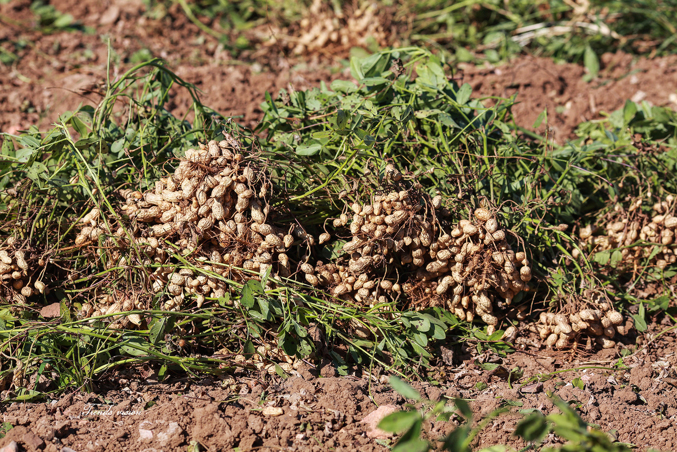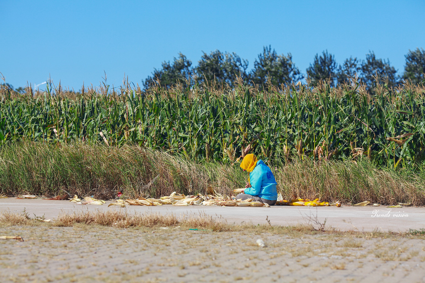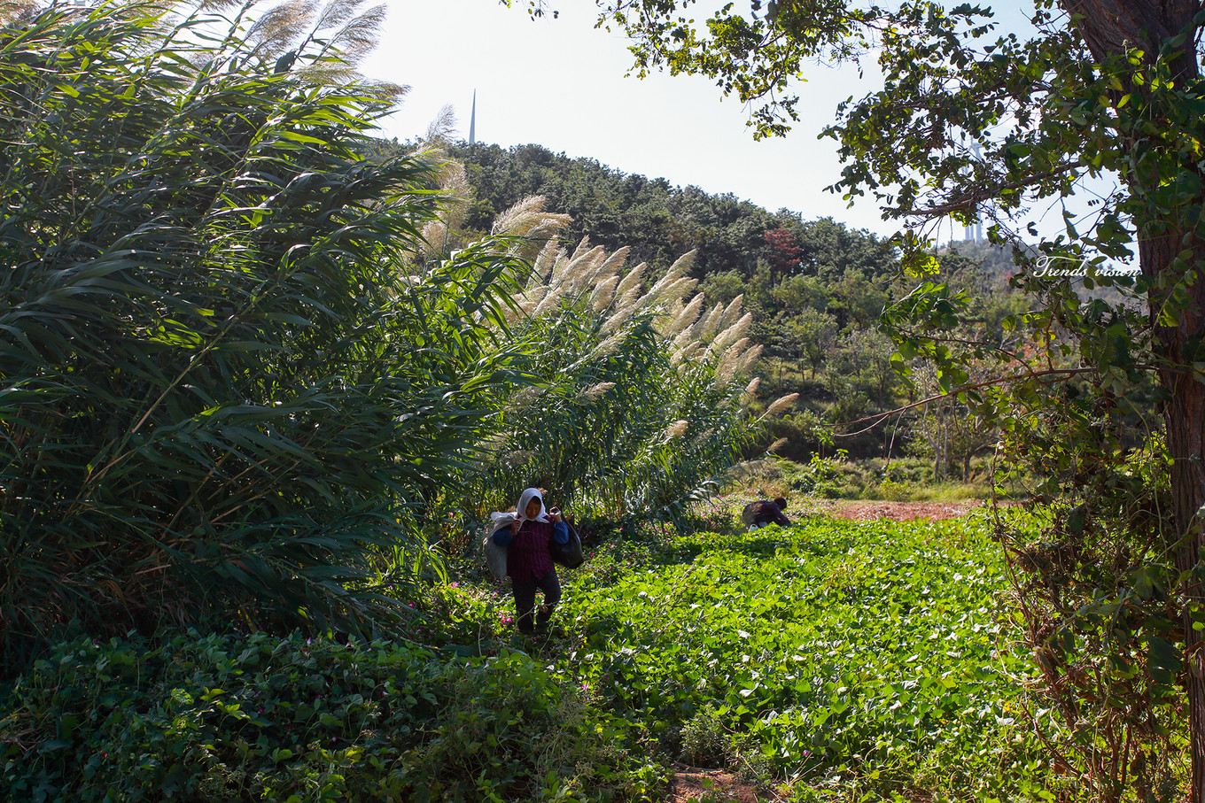 下圖十月份正好是秋收的時節(jié),到處是瓜果收獲,圖中拍攝地點是月牙灣,在農田中收獲花生的農民,與月牙灣的美景融為一體。