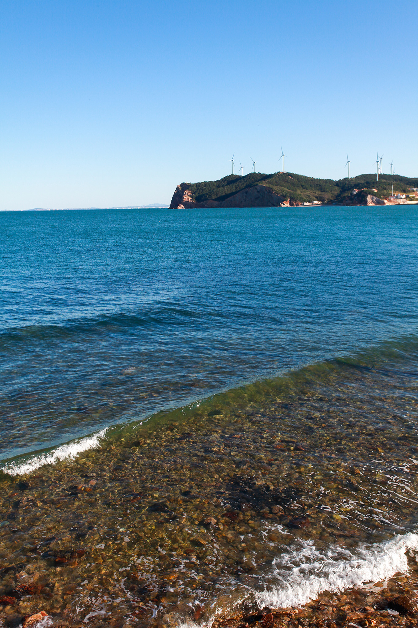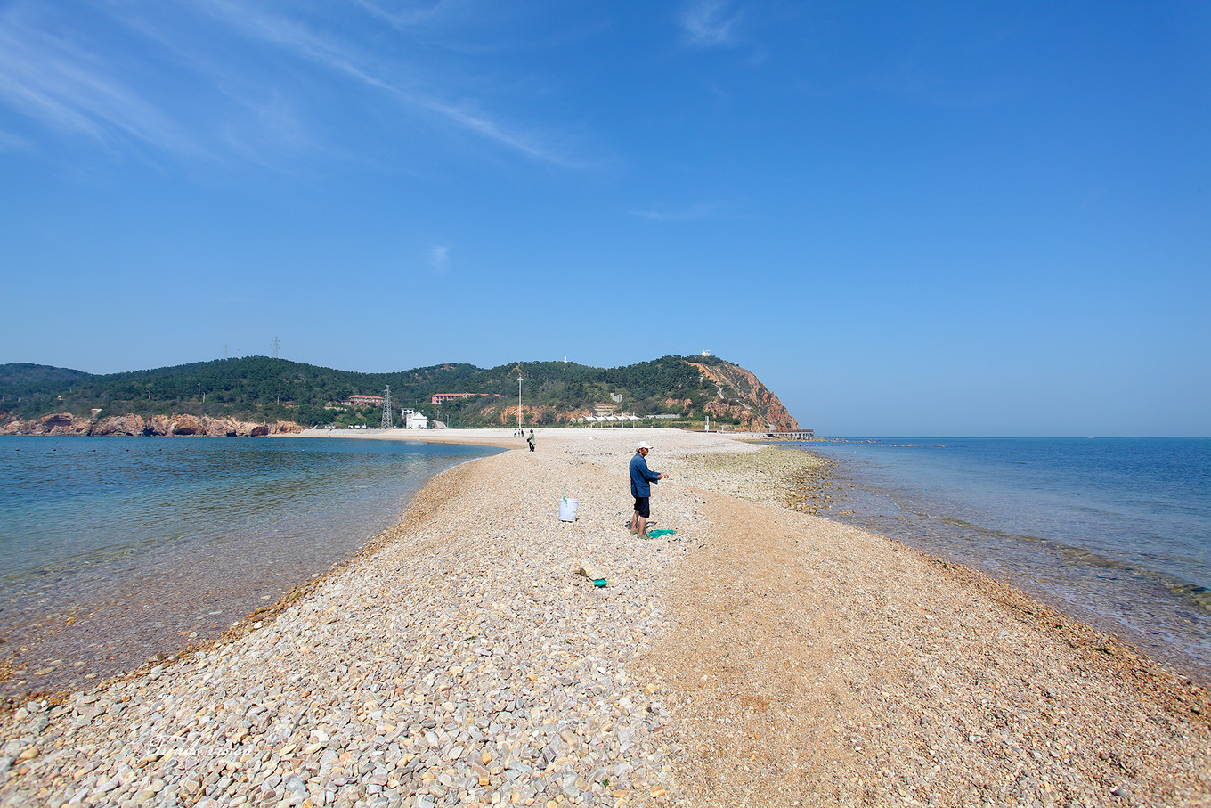 木梯棧道的盡頭就是長島最著名的地理坐標:長山尾,黃渤海交際線。長長的尾巴狀的球石海岸消失在黃渤海交界處,兩邊是清澈的海水,而在海岸邊只要你翻開淺水處的石頭,石頭下竟然有小螃蟹,小魚藏在里面。