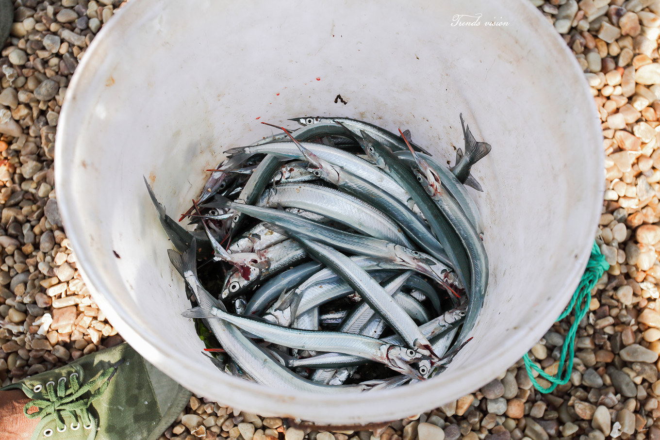 下圖在黃渤海交際線附近打漁的漁民,一條掛滿魚鉤的繩子,一次下去竟然釣到了半桶魚。
