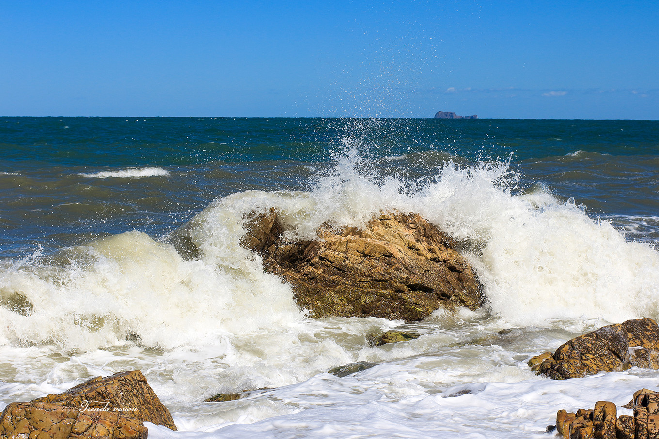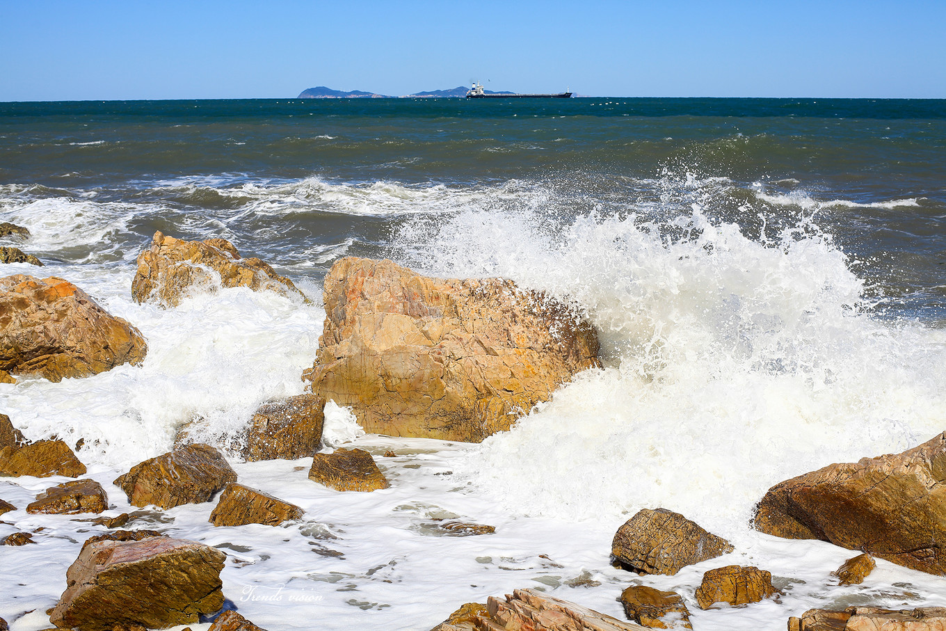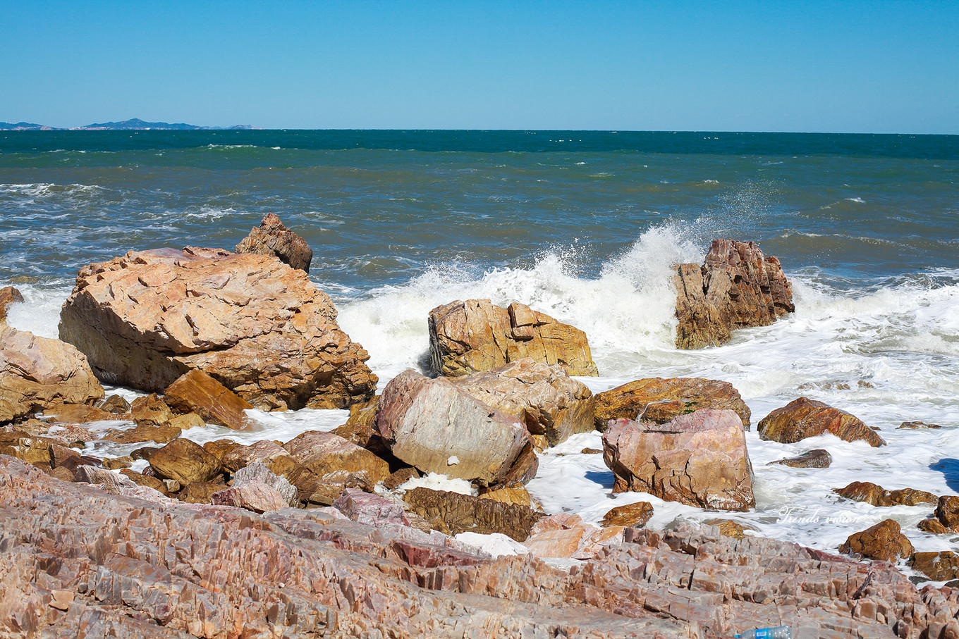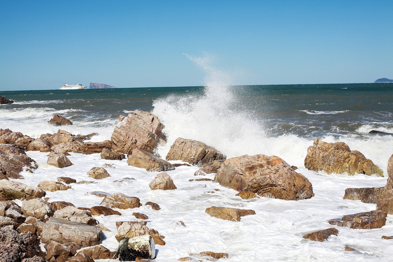 下圖大頂山山腳下的亂石海灘,大浪撲打礁石激起了巨大的浪花。