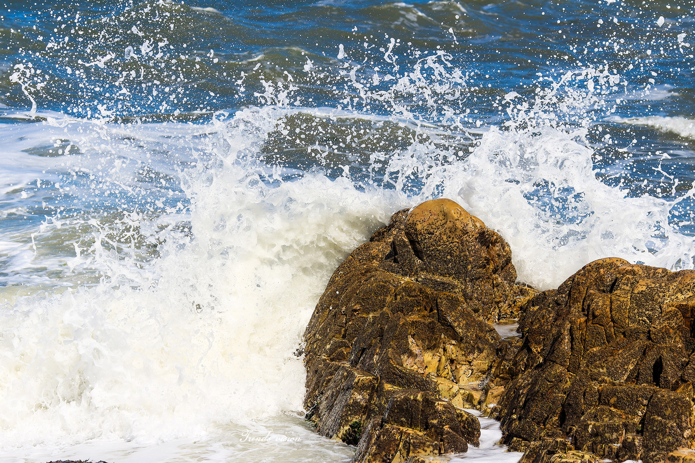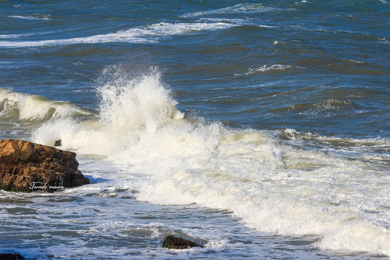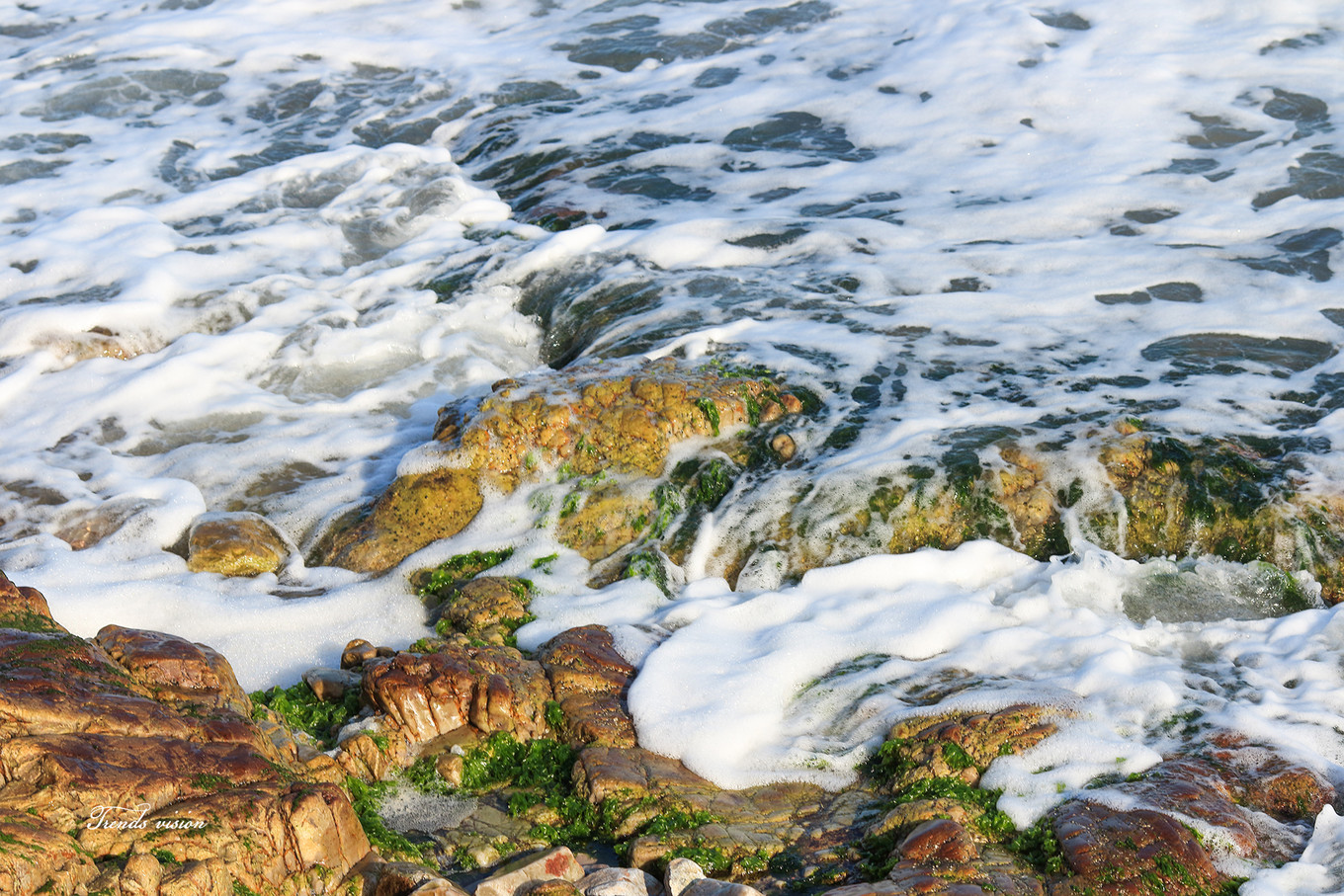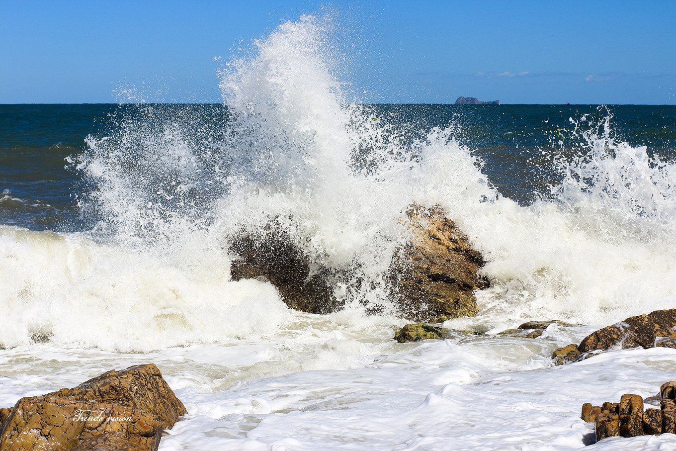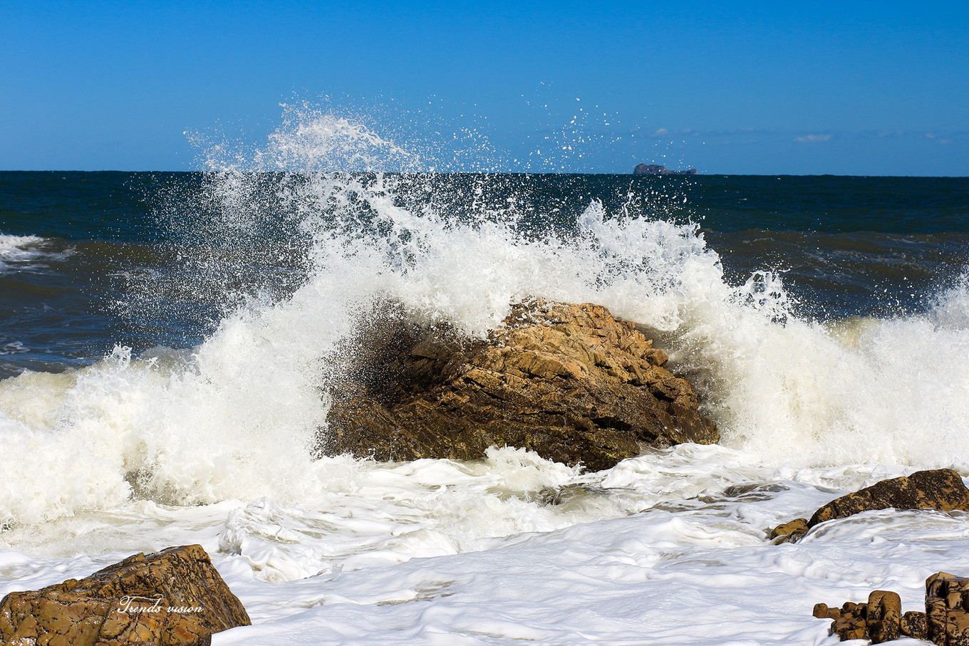 下圖大頂山山腳下的亂石海灘,大浪撲打礁石激起了巨大的浪花。