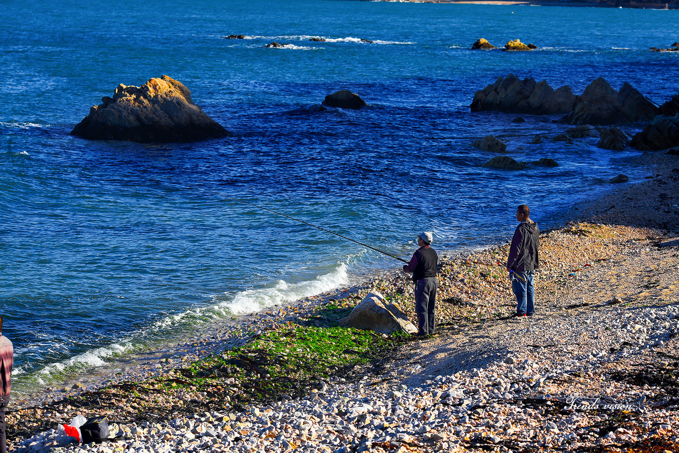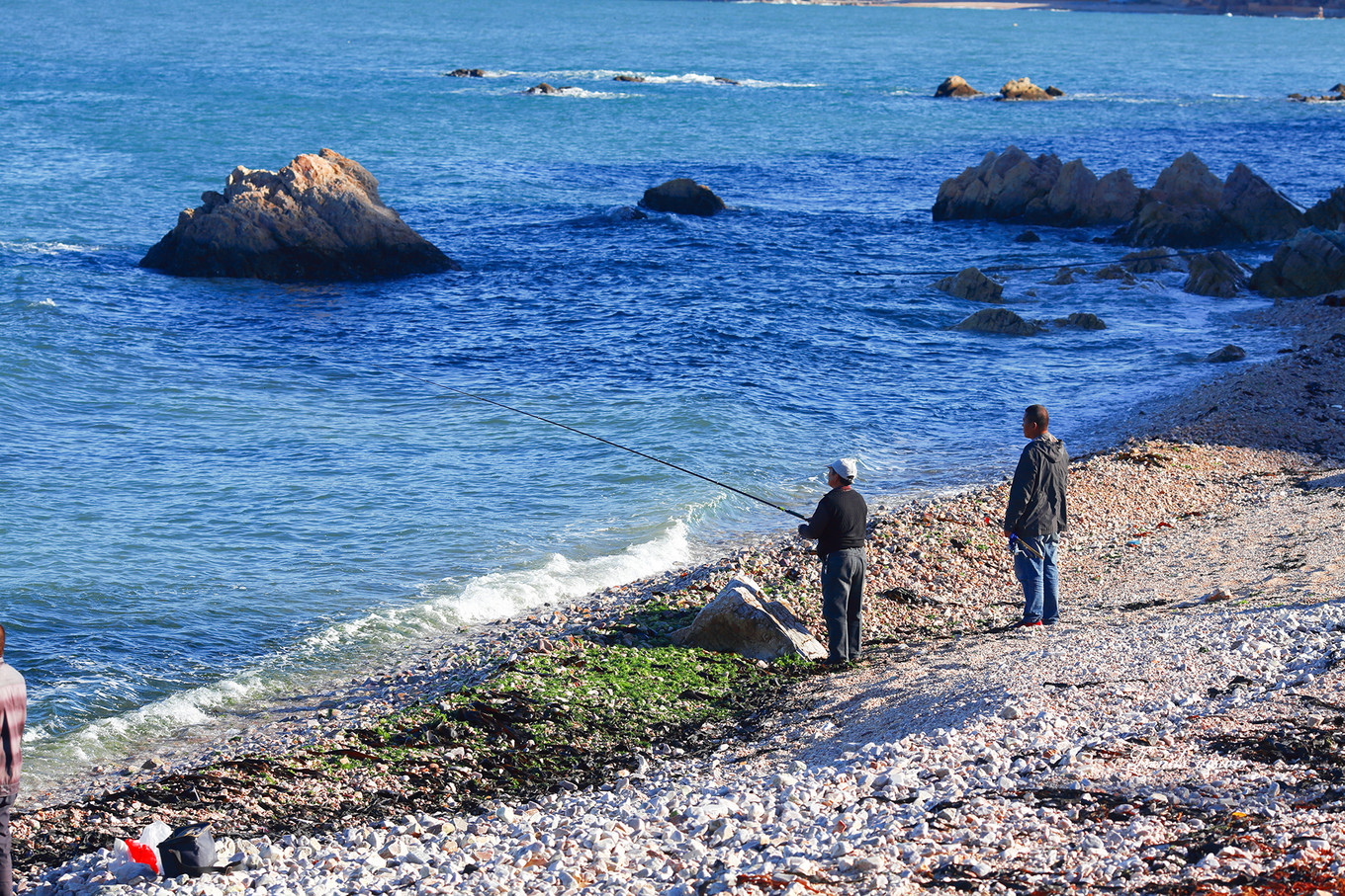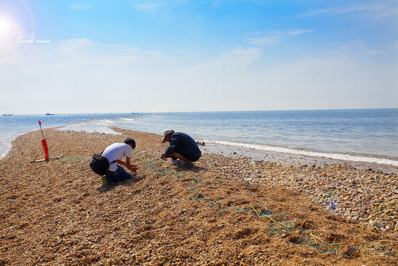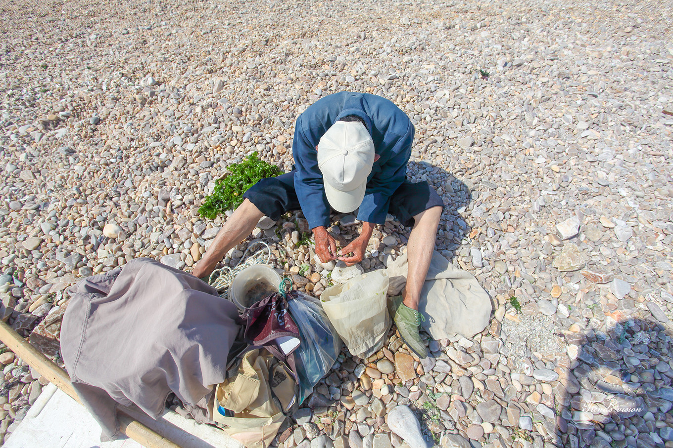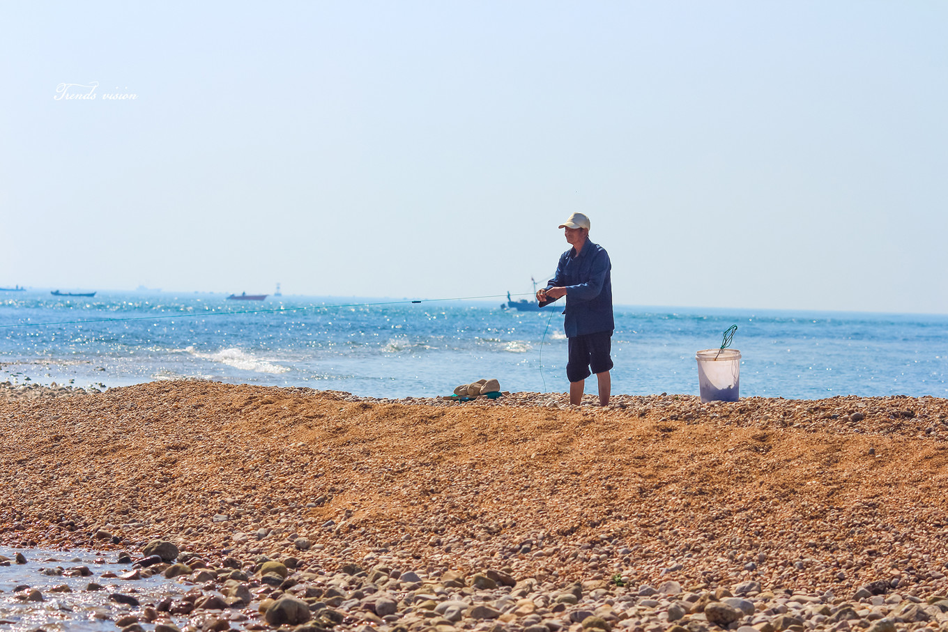 我們到南長山長山尾的時候,正當正午,當天氣溫高,正午陽光刺眼,白茫茫的石頭海岸上三三兩兩的人偶爾走過,正好我們在長山尾碰到了一個老漁民,老人的袋子里有很多蝸牛狀的小海螺,老人用石頭敲開外面的硬殼,把里面的肉放在身邊的小桶內。