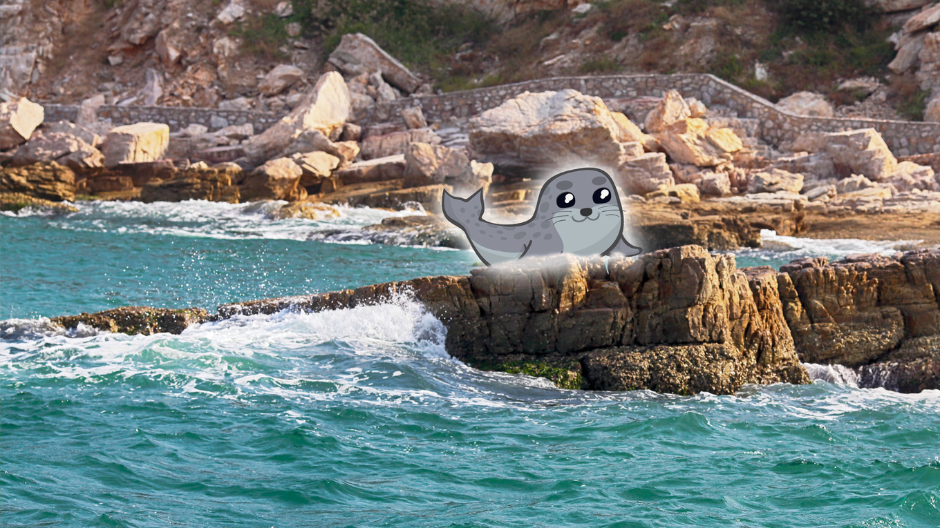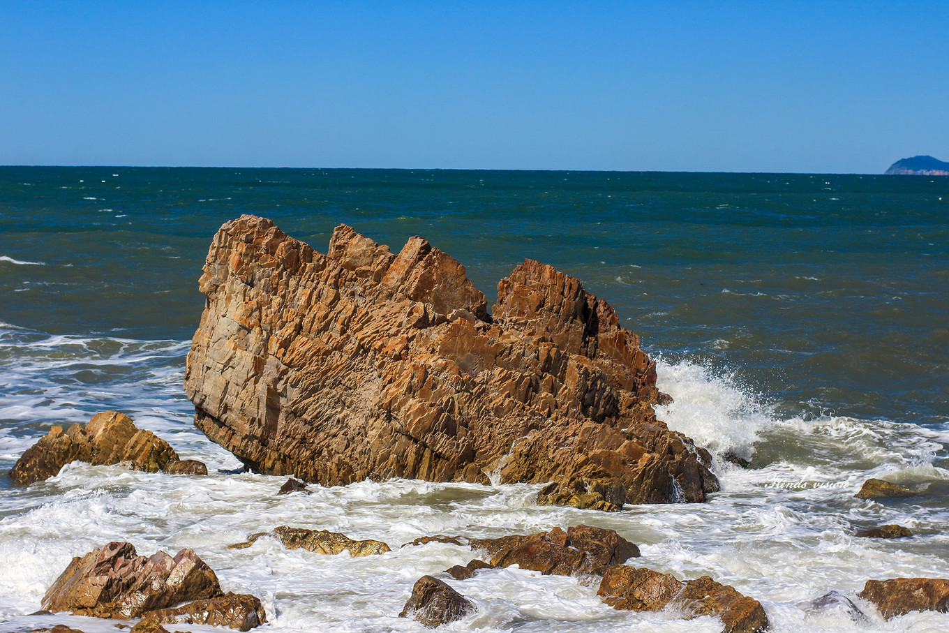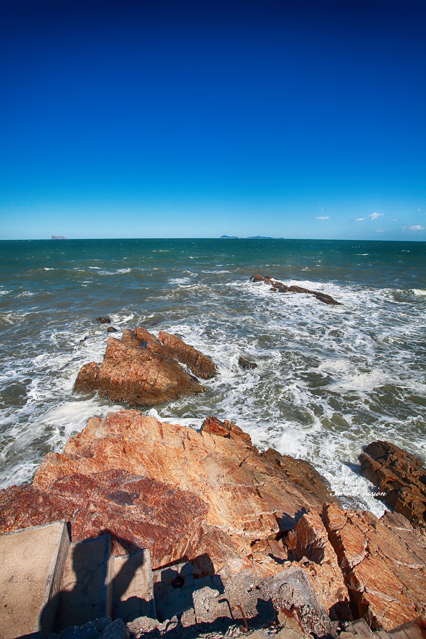 下圖釣魚島海豹礁,最坑的景點,到這里的時候廣播里用甜美的聲音說道:“前方的巖石是海豹礁,耐心的等待,會有海豹從海底游上海岸的哦”,咱于是一臉單純的耐心等待,結果船才停留了2分鐘不到就開走了,全程除了礁石就是浪花。只好后期P個海豹安慰下自己。