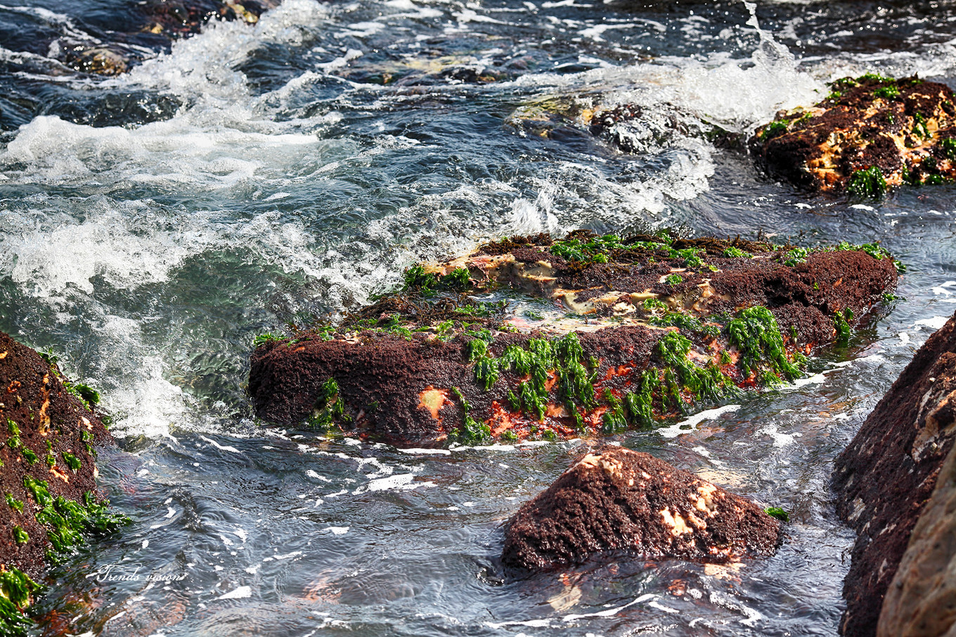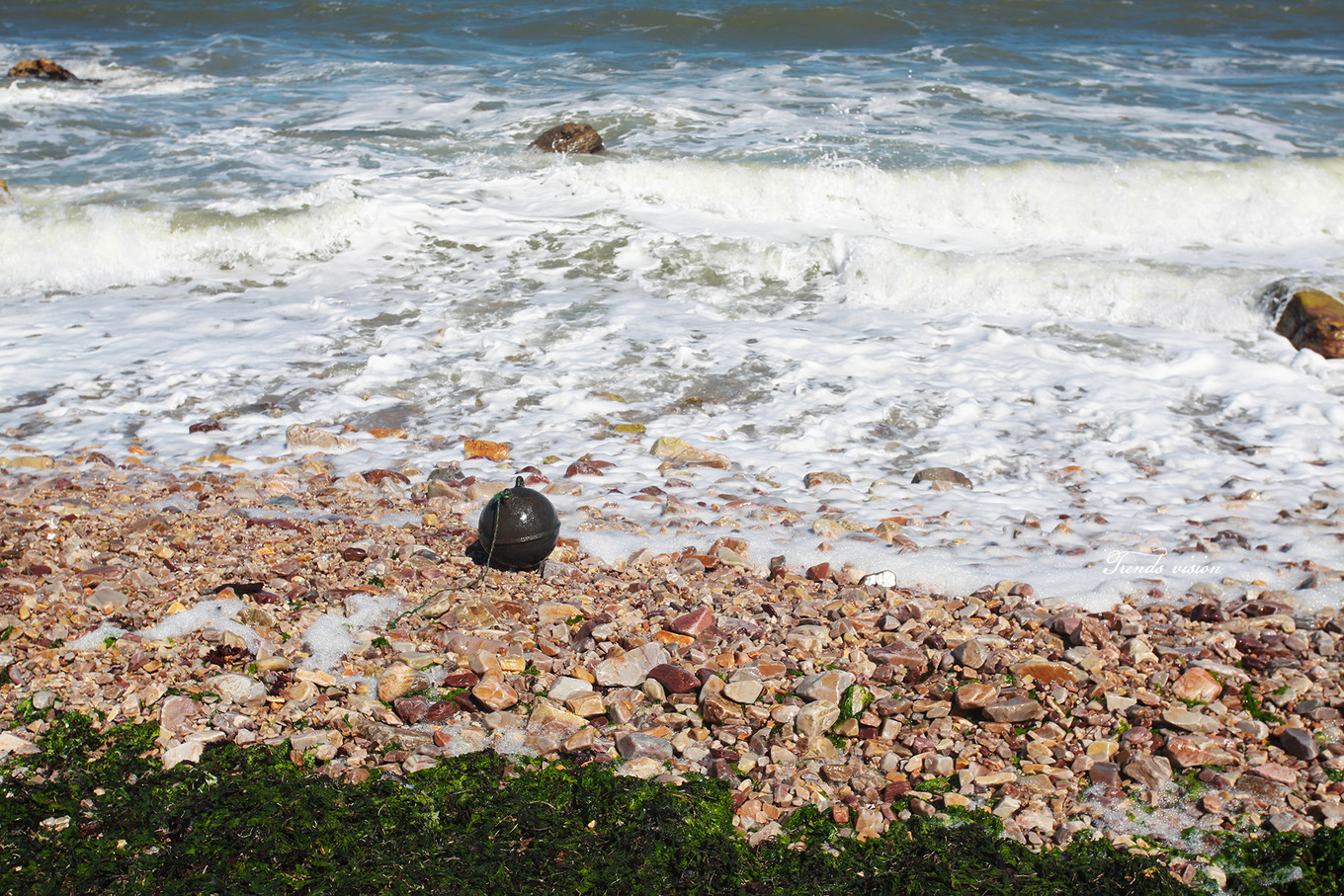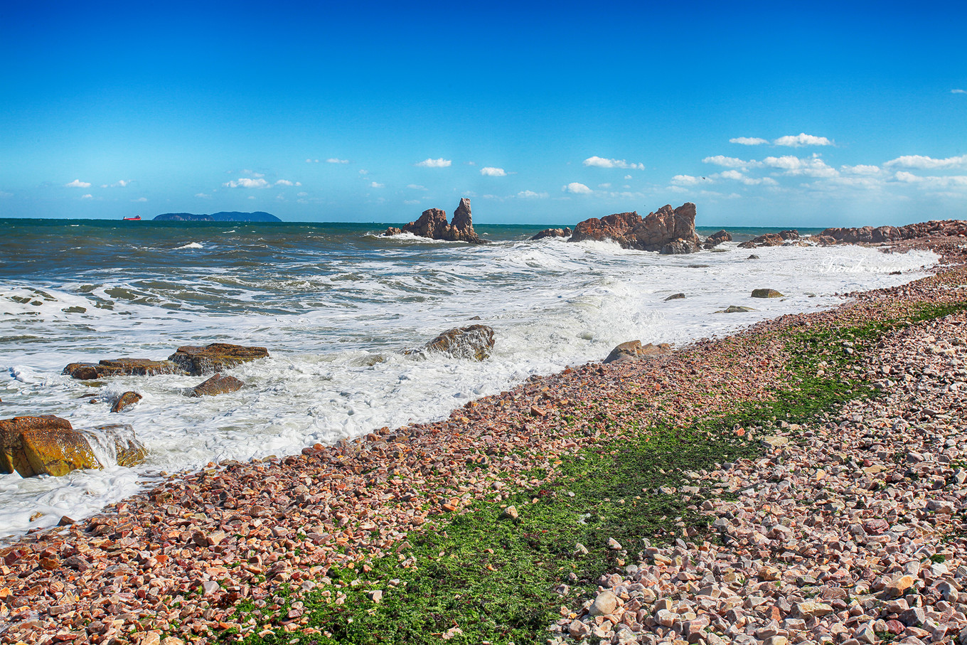 林海海灘仍然是球石海灘,海灘上是鴿蛋大小的球石,長年累月被海浪沖擊的滾圓滾圓的,異常光滑圓潤,密密麻麻的鋪滿了整個海灘,喜歡光腳的童鞋走在這樣的沙灘上是相當硌腳的。在海岸上有很多礁石,被海浪沖擊的已經很圓潤了,千萬不要濕腳走在石頭上,石頭上有很多苔蘚海草,見水就會變的很滑,一不小心就是個跟頭,撲騰一下栽倒到水中可就慘嘍。