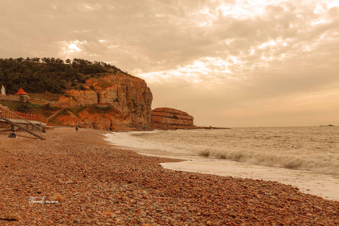 店子村預定好的農家樂,距離九丈崖五分鐘的腳程,所以第一站到的是九丈崖景區(qū),九丈崖的海灘上全是鴿蛋大小的球石(鵝卵石),光著腳丫走在上面簡直是強烈的腳底按摩,就像奔跑吧兄弟的指壓板,九丈崖適合拍攝夕陽。