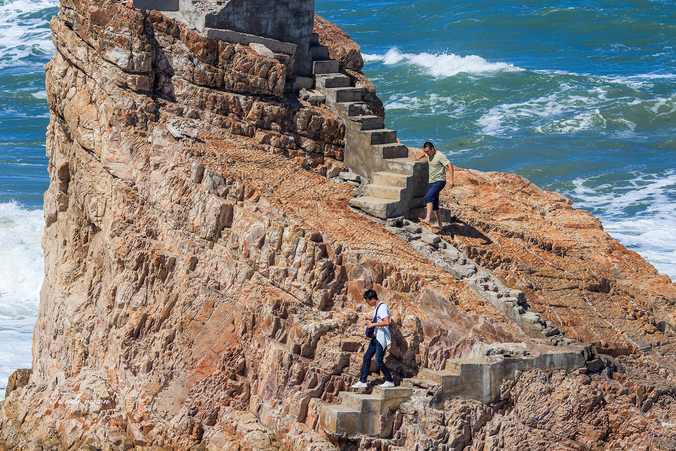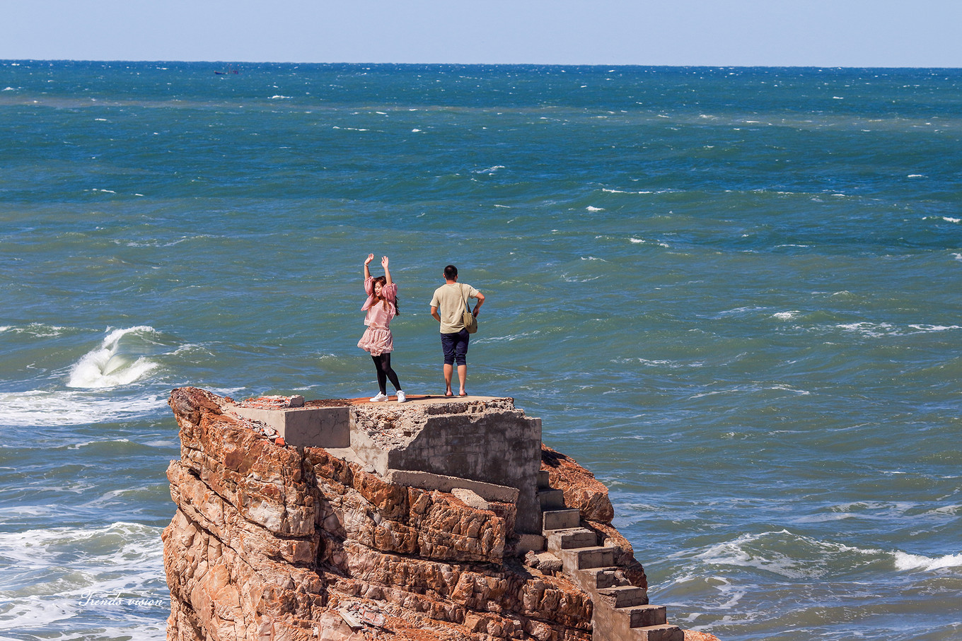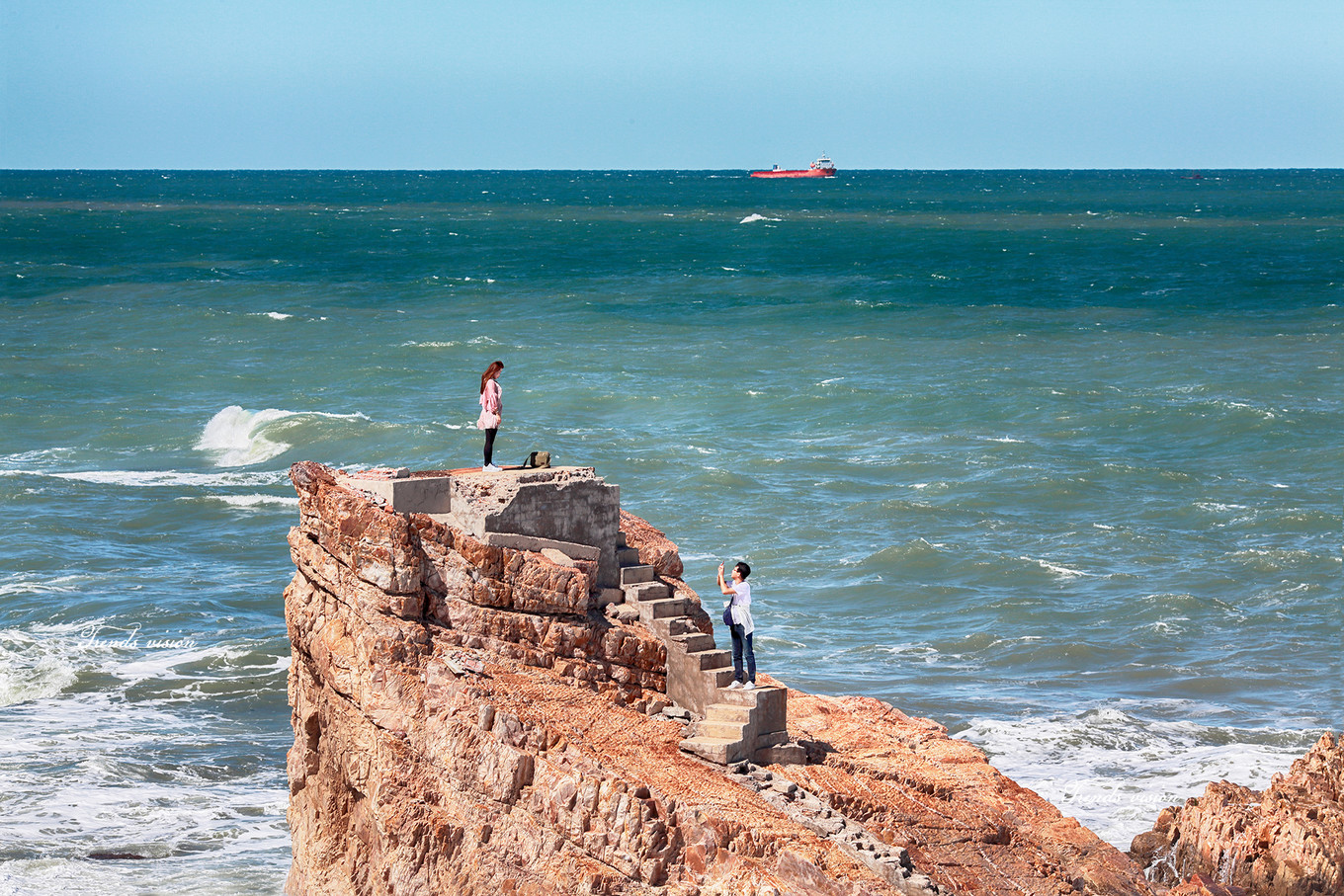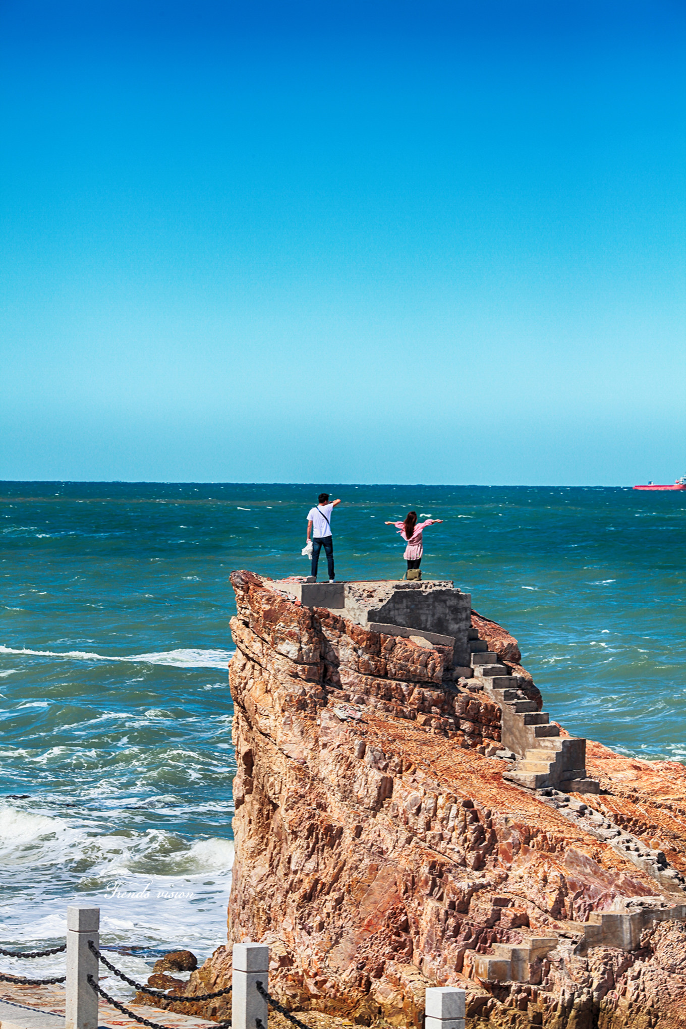 林海公園給了我們很大的驚喜,因為太美了,這里也有人工建筑,但跟周圍的環(huán)境融合的很好,我們從峰山一路而來,峰山的風光讓我們一度很失望,以為南島的景色也僅此而已了,但當我們到了6號風機,有發(fā)現(xiàn)一個呈45度角度幾乎垂直向下的階梯(據說365層階梯,反正我是下階梯下癱了)的時候,眼前就突然的豁然開朗了,階梯下是一片藍色海洋,清澈的海水竟然可以直接看見水底的石頭。迎面是從海上吹來的涼風,在悶熱的峰山上,焐了一身汗,到了林海讓海風一吹,豁然開朗。