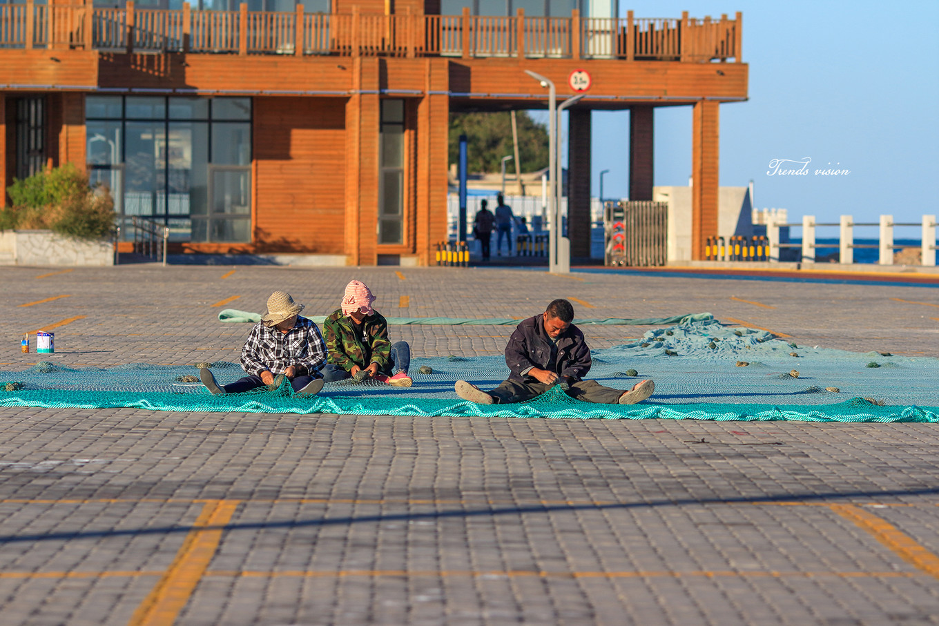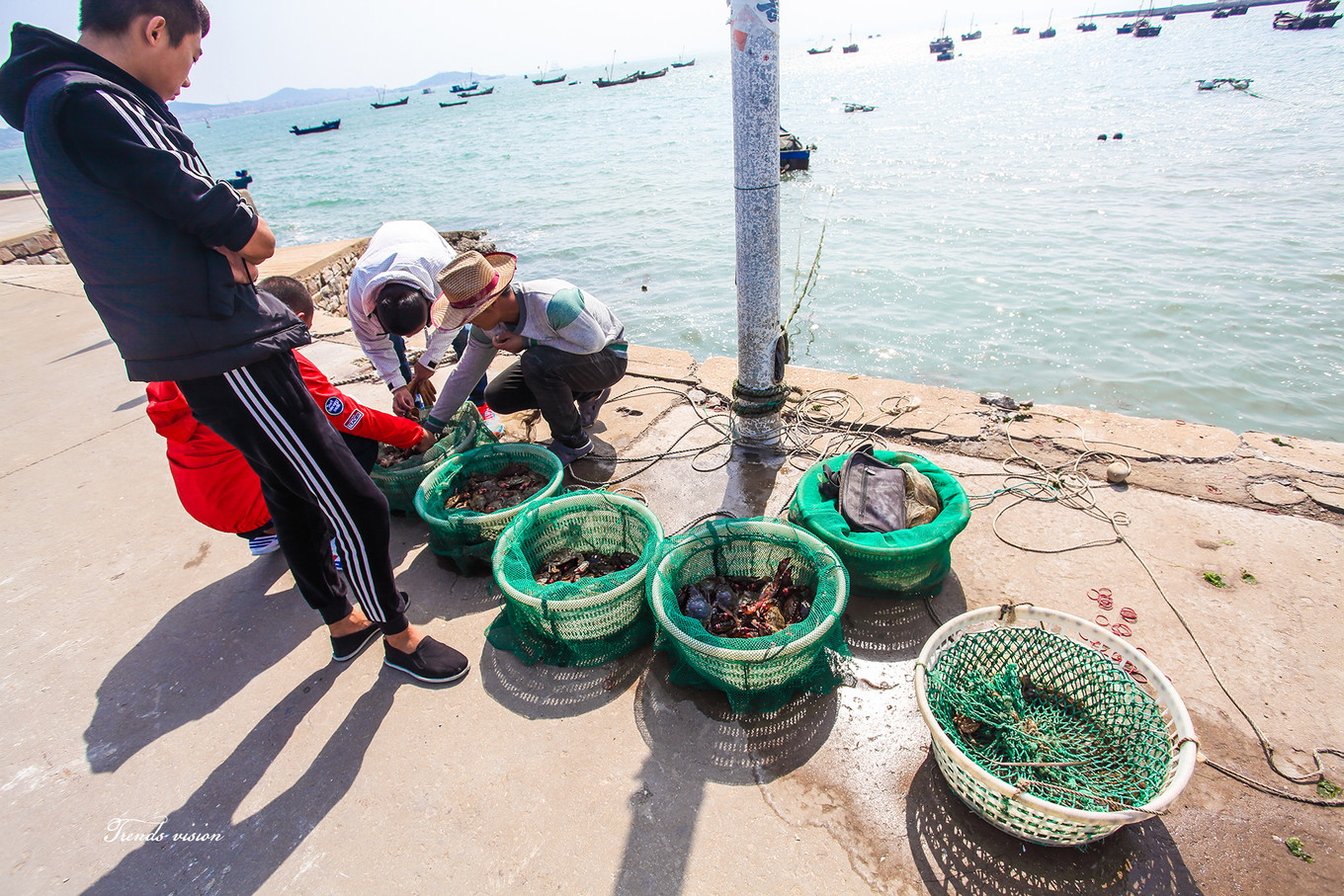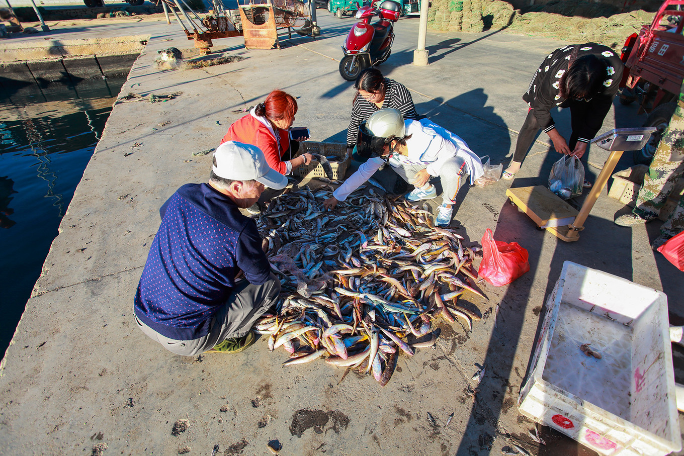 來到長島這個島嶼縣,魚獲海鮮當然是少不了的一道風景,我們專門跑到了南島與北島的交界處,連島大橋的漁港碼頭,問了在地上織魚網的漁民,他們順手一指:“就在那里,打漁回來的漁船在碼頭卸貨呢,大家都在那里買魚,現(xiàn)在就有幾艘”。