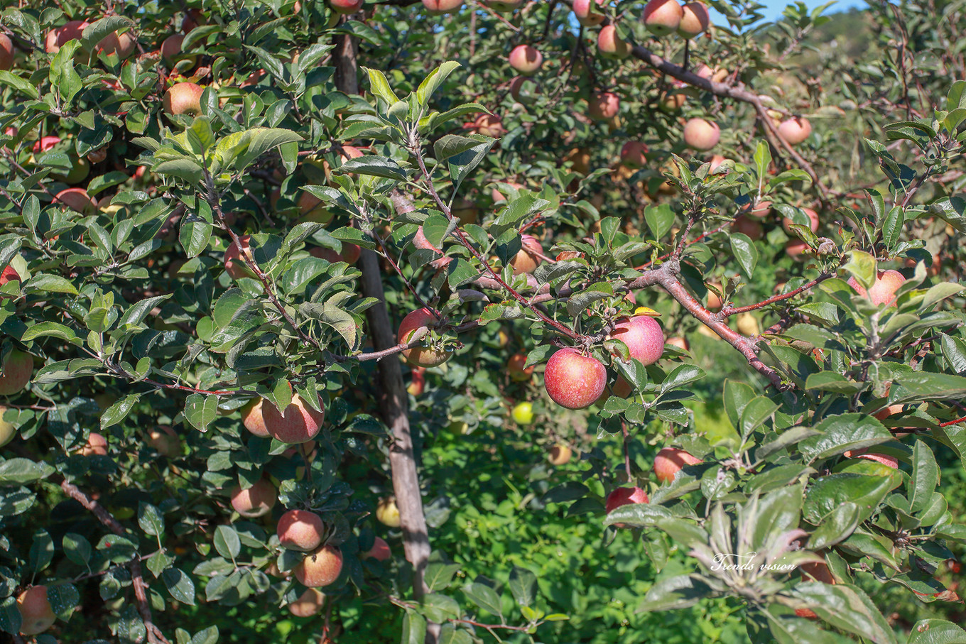于是咱就直接跑進了果園,瘋了一樣狂拍(哈哈不是狂摘),不久果園主人竟然突然出現(xiàn)在我的身后,一時間我驚慌失措,不知道怎么應對,然而主人只是輕聲的關切了一下:不要摘果子,紅富士還沒有完全成熟。于是我慌亂的說道:“沒事放心吧我不會摘果子的,只是要拍幾張照片”。果園主人竟然欣然允諾,拍吧。然后果園主人開著她裝滿蘋果的三輪一溜煙就跑開了。哇這就是長島的淳樸民風,他們對外人竟然是這么的信任,幸好咱不是壞蛋。