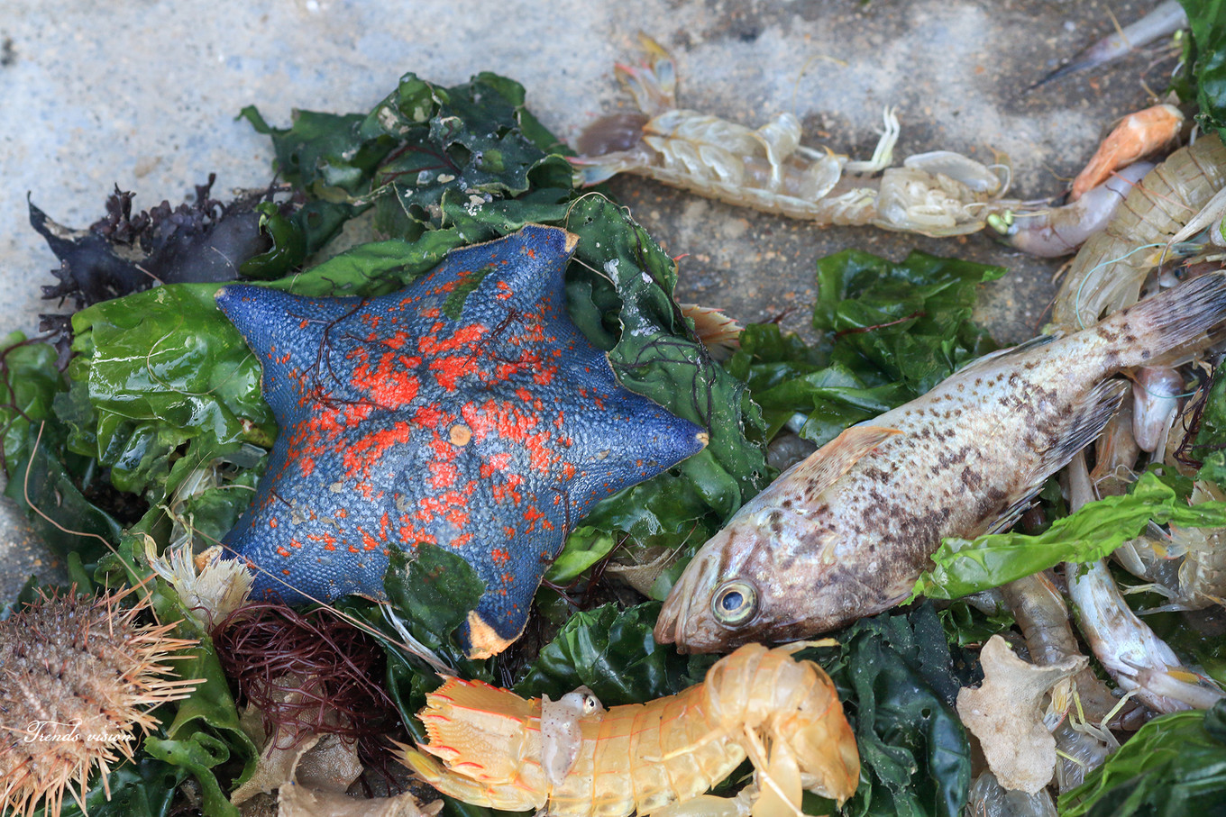 下圖漁港碼頭上漁民扔掉的海鮮,有海星、小黑魚、皮皮蝦,竟然都是活的。咱可想把那只藍色的海鮮給拎走了,可惜是活的,媳婦嚇的就是不敢拿那個玩意,好吧算了,黏糊糊的還是活的萬一咬咱一口可咋辦。