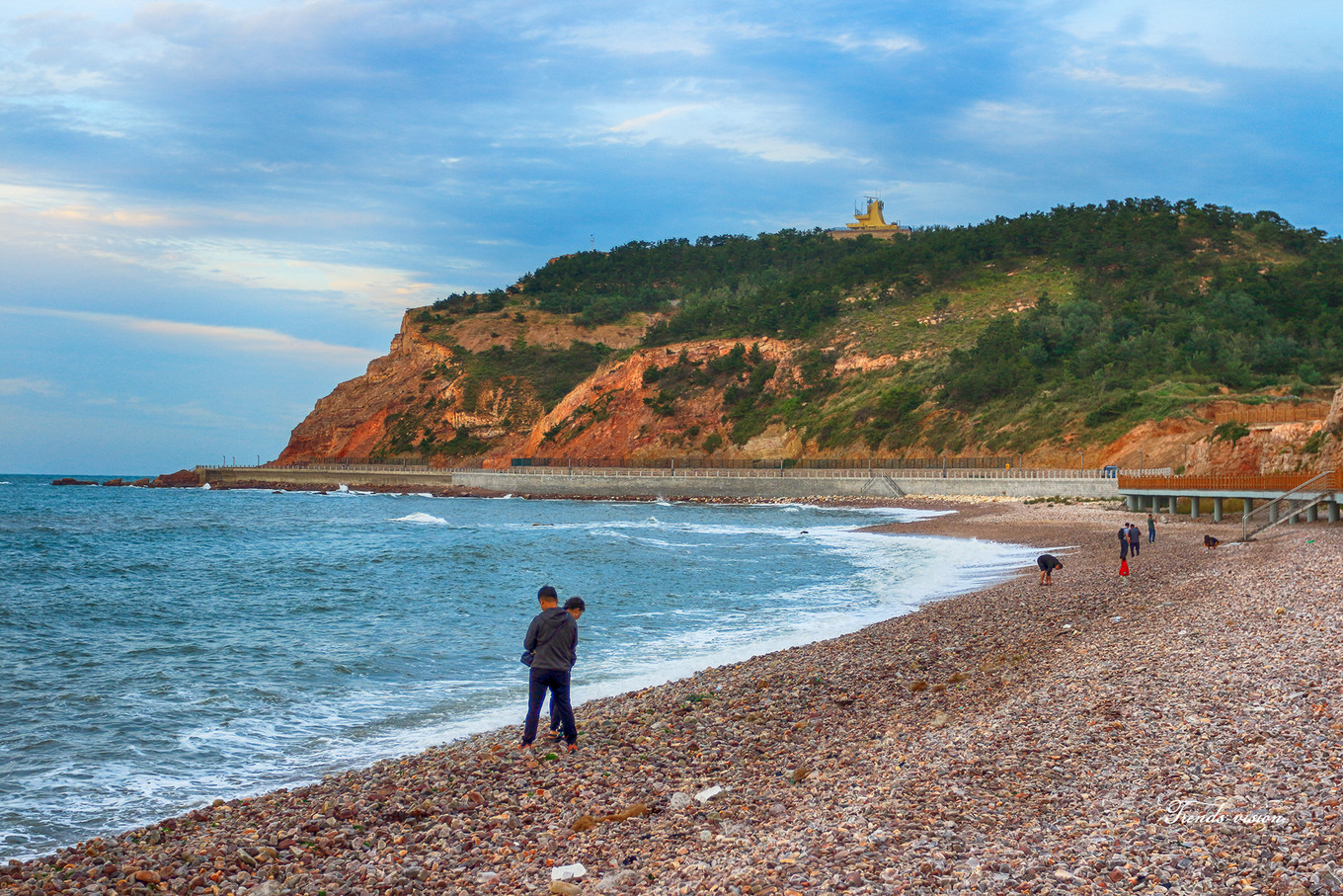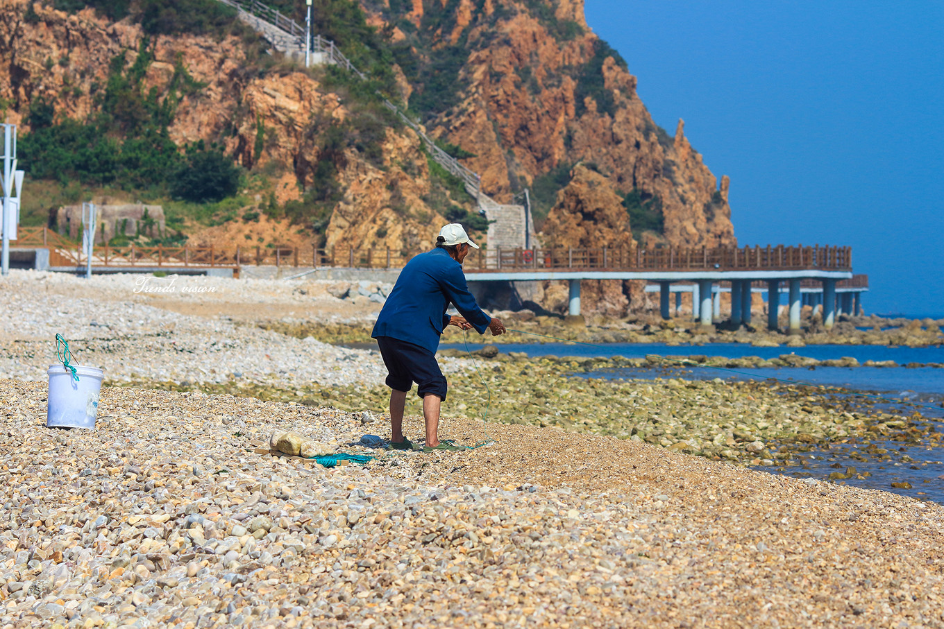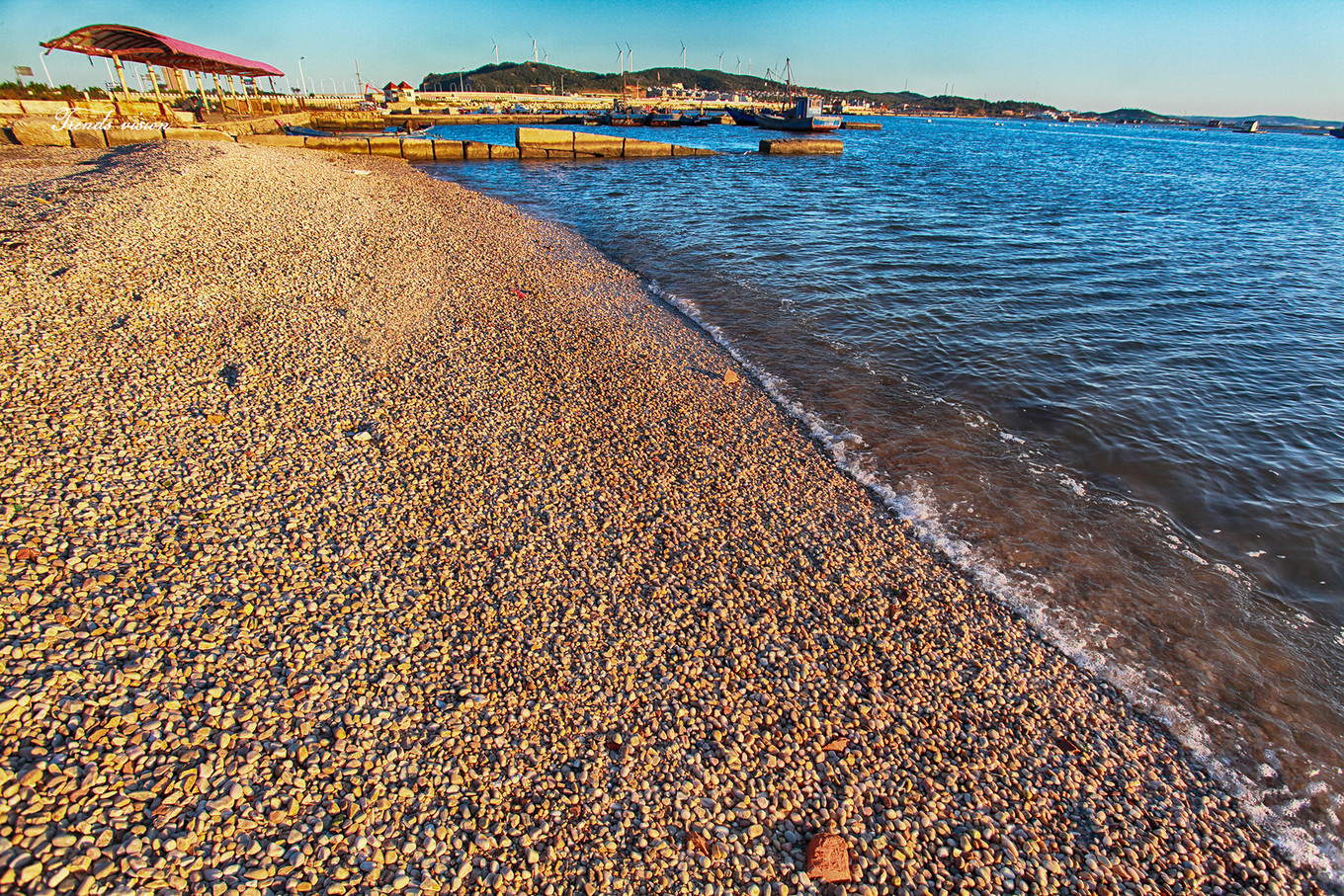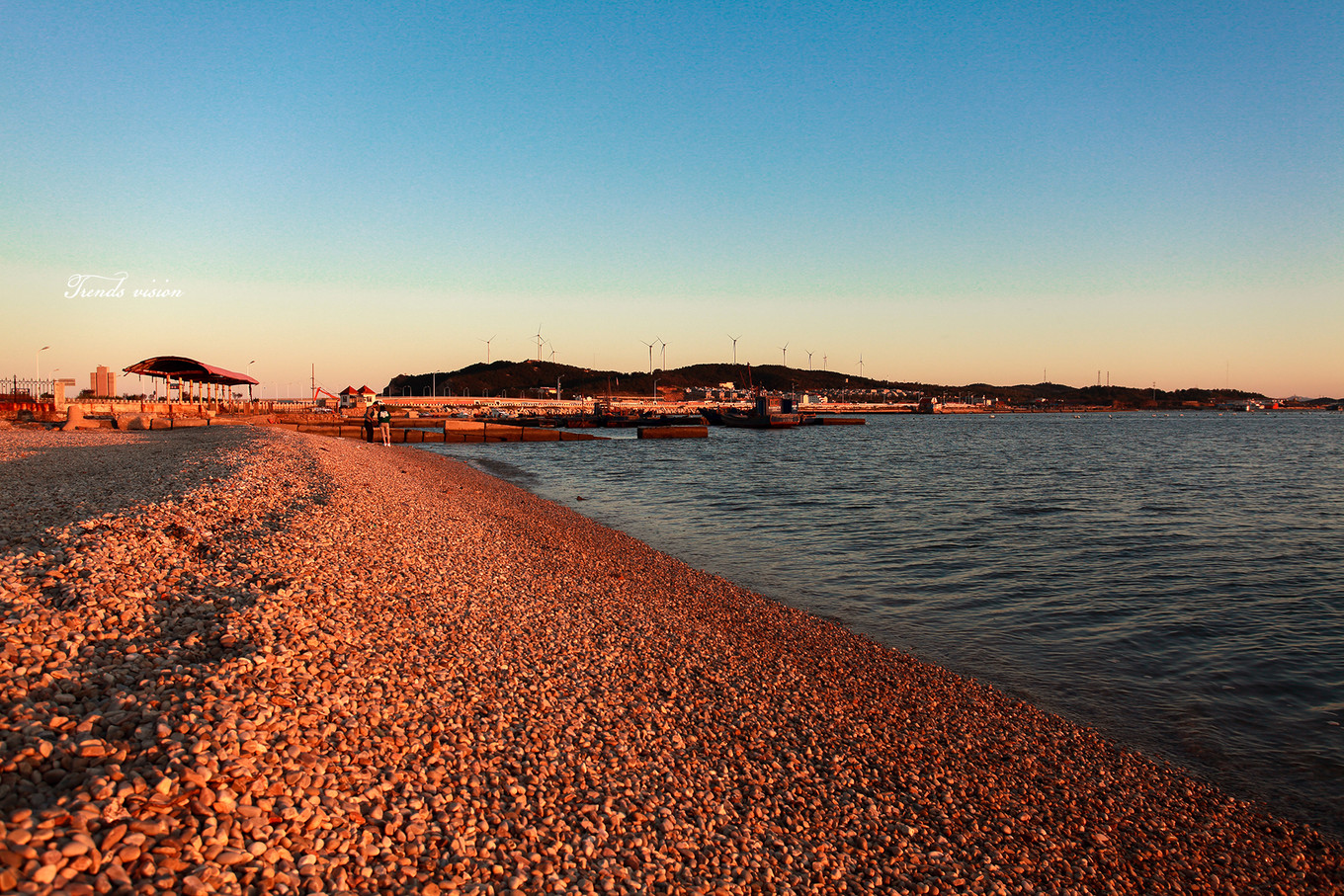 奇石灘,從兩個風車之間順山路下到奇石灘,沿著環(huán)路繞過大頂山、羊鼻子山、北山、海螺山、太平山,至長島水產園的海港。一路都有非常不錯的風光。由其在傍晚走到南島與北島之間的大橋旁邊的漁港碼頭,我們發(fā)現(xiàn)了一個鴿蛋卵石海灘,海水清澈見底,岸邊是滿目的卵石個個如鴿蛋大小,被海浪淘洗的圓潤光滑,而且最為重要的是這里竟然沒有人,只有我們兩個人,這么美的海岸竟然被我們承包了。到這里的時候正好落日,金紅色光影籠罩下的魚港,海岸上停泊著幾艘漁船,落日紅著臉蛋沉入山涯,簡直美的一塌糊涂。