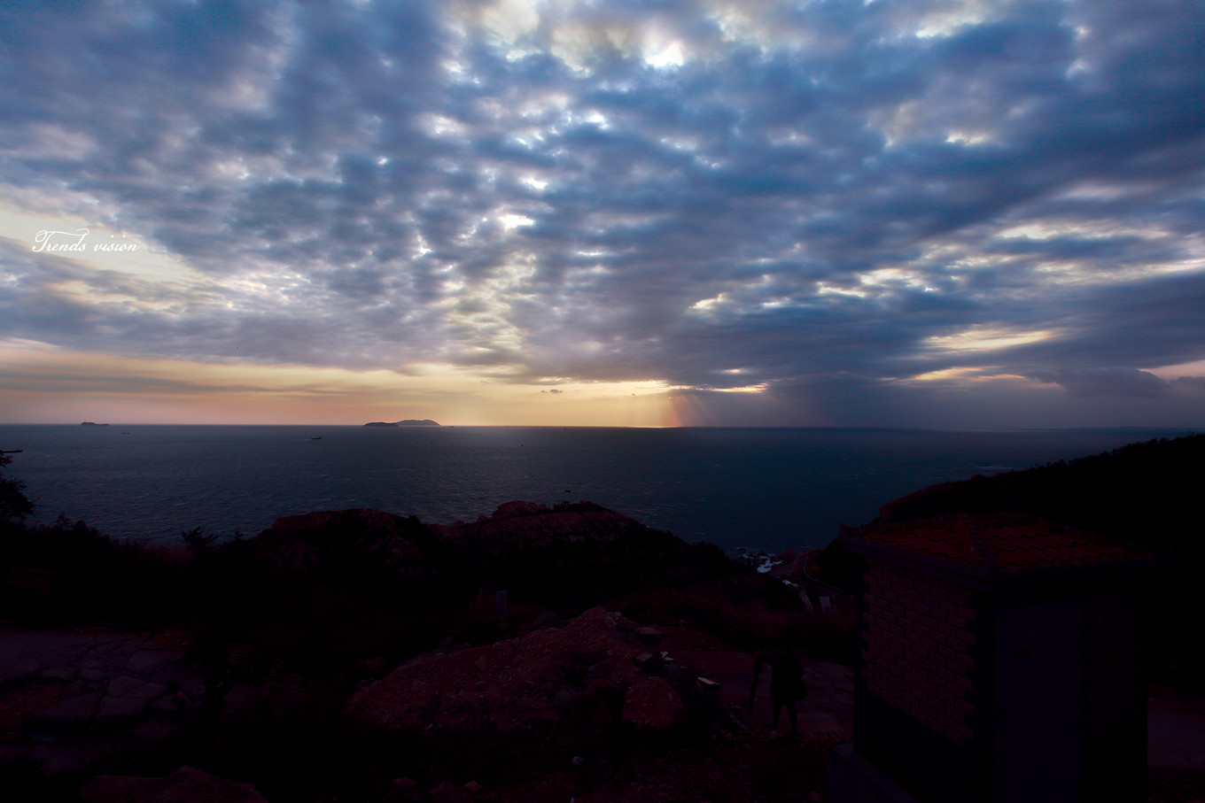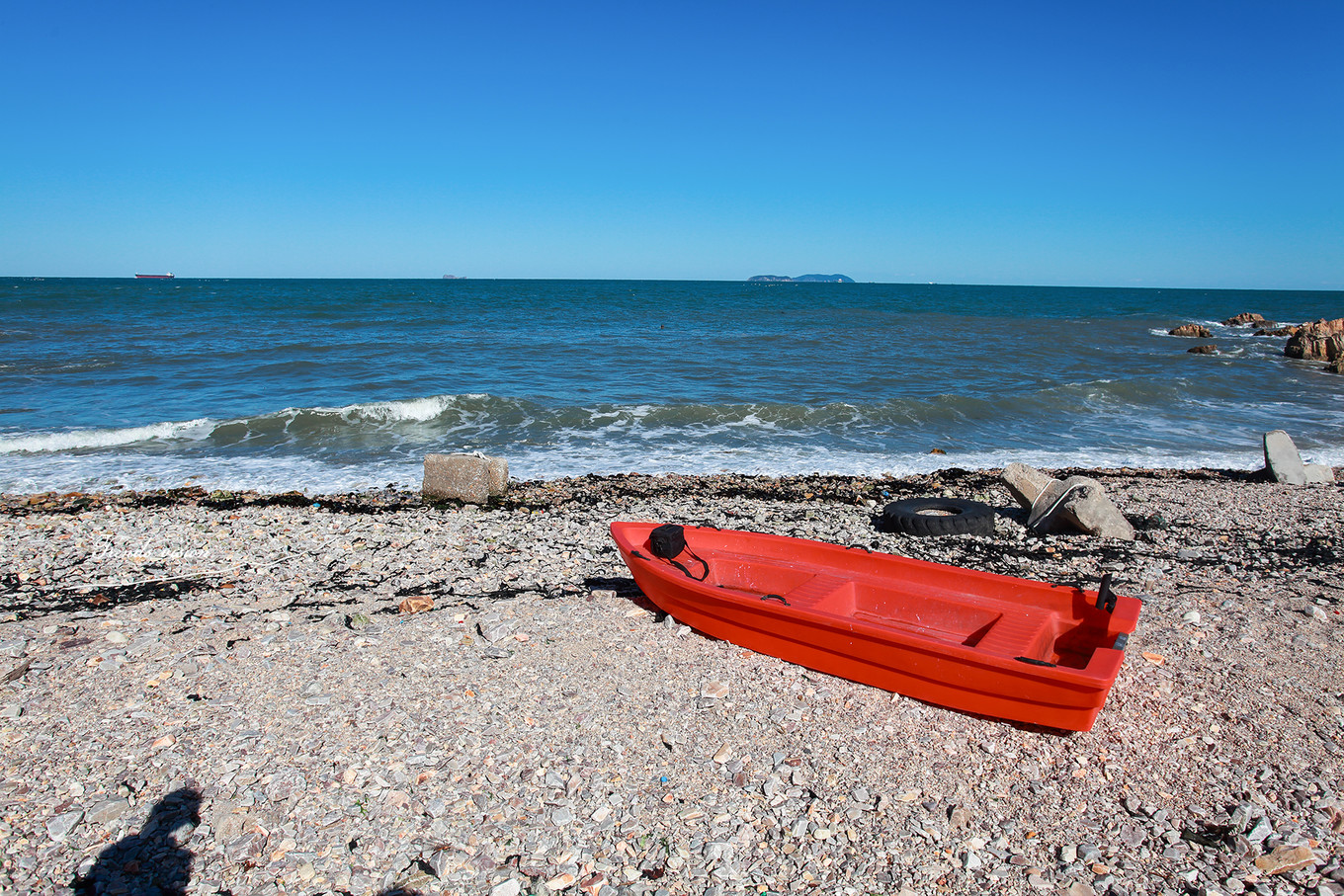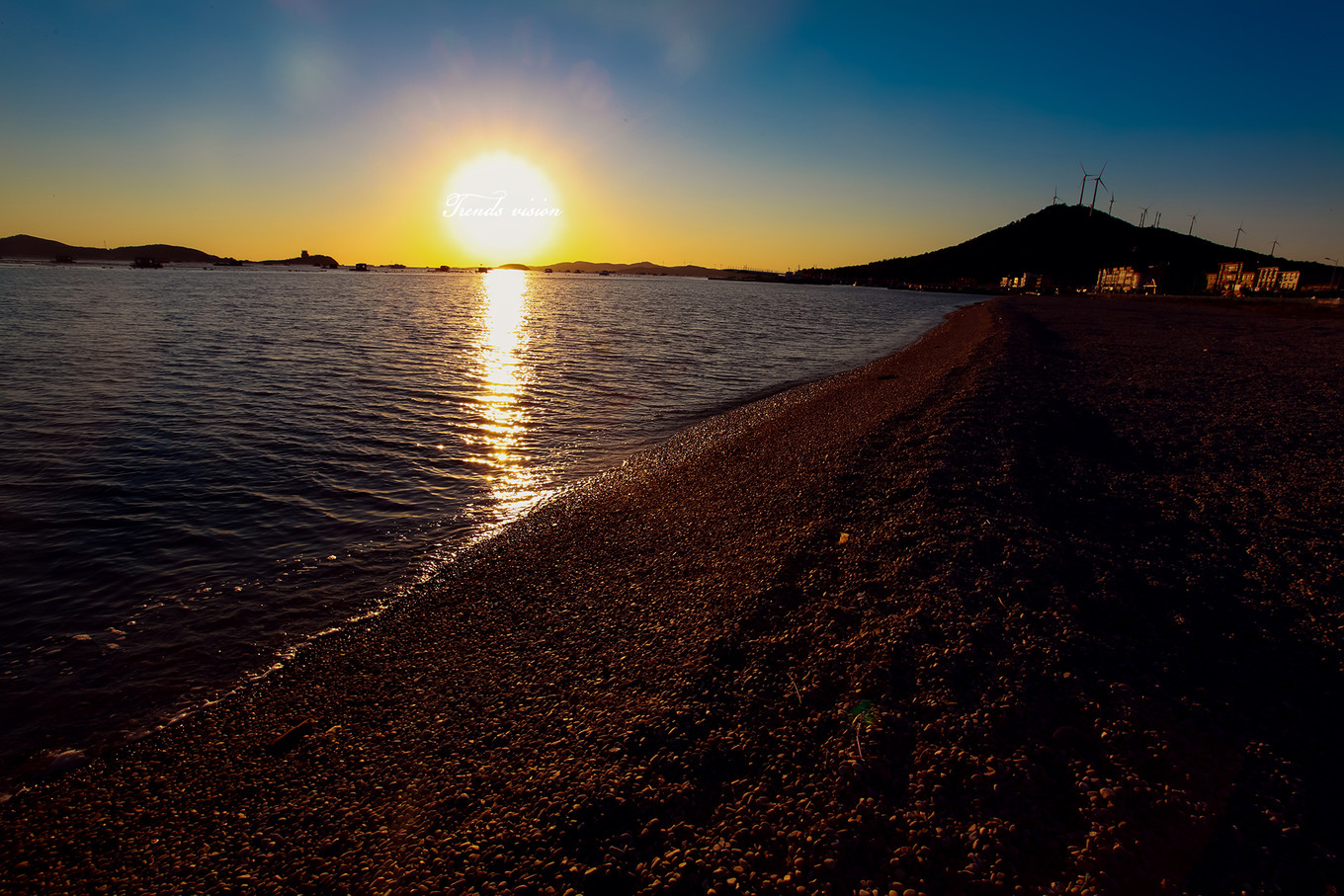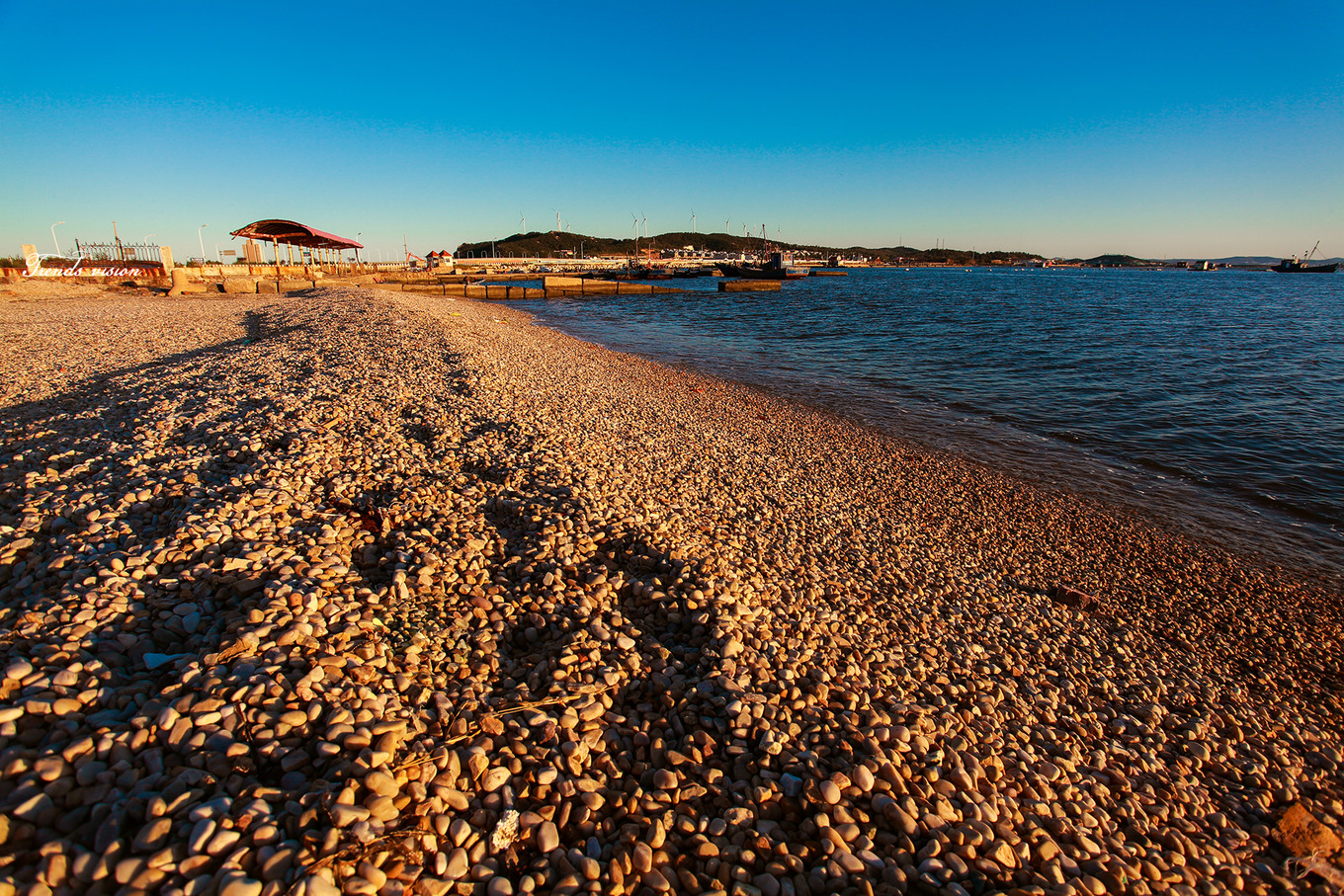 奇石灘,從兩個風車之間順山路下到奇石灘,沿著環(huán)路繞過大頂山、羊鼻子山、北山、海螺山、太平山,至長島水產園的海港。一路都有非常不錯的風光。由其在傍晚走到南島與北島之間的大橋旁邊的漁港碼頭,我們發(fā)現(xiàn)了一個鴿蛋卵石海灘,海水清澈見底,岸邊是滿目的卵石個個如鴿蛋大小,被海浪淘洗的圓潤光滑,而且最為重要的是這里竟然沒有人,只有我們兩個人,這么美的海岸竟然被我們承包了。到這里的時候正好落日,金紅色光影籠罩下的魚港,海岸上停泊著幾艘漁船,落日紅著臉蛋沉入山涯,簡直美的一塌糊涂。