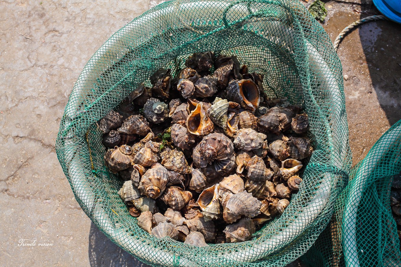 下圖老漁民,用石頭敲開一種蝸牛樣的海螺,收集了足足有半桶