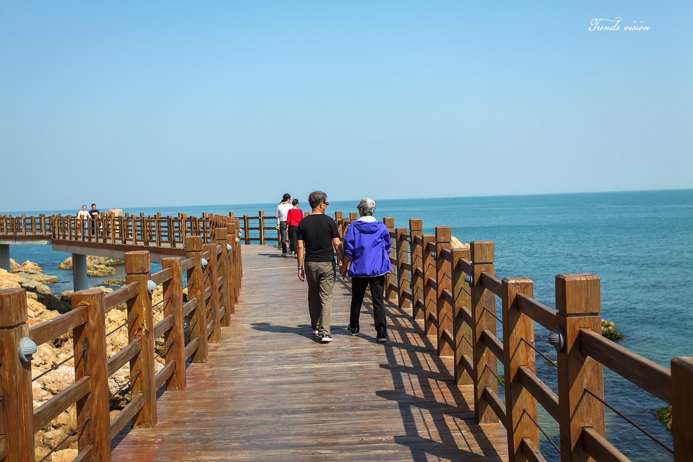 逛完愜意的海灘,往南順著大海走,就是足足有1公里長的木梯棧道,部分棧道底部是用玻璃做的,棧道離地大概有5米多,走上玻璃棧道腳下是礁石大海,腳下的海浪沖擊著海岸上的礁石,水中竟然還有小魚游弋,很美的。