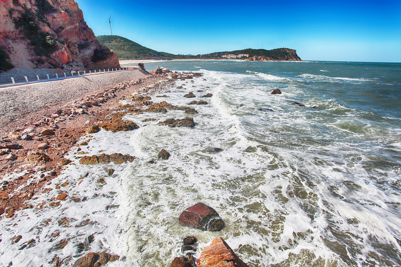 月牙灣景點跟九丈崖其實是一體的一個景點,順著黃紅藍色的道路,可以從一個景點到另外一個景點,好像在山東的各個旅游區(qū),半月形的沙灘到處都有,來到長島仍然不例外,月牙灣。呈半月狀的球石海灘,向北是一望無際的大海,在大風的吹動下,海水打在岸邊的石頭上激起了很大的浪花,水霧隨著風向飄向空中,打的相機的鏡頭上都是水珠。