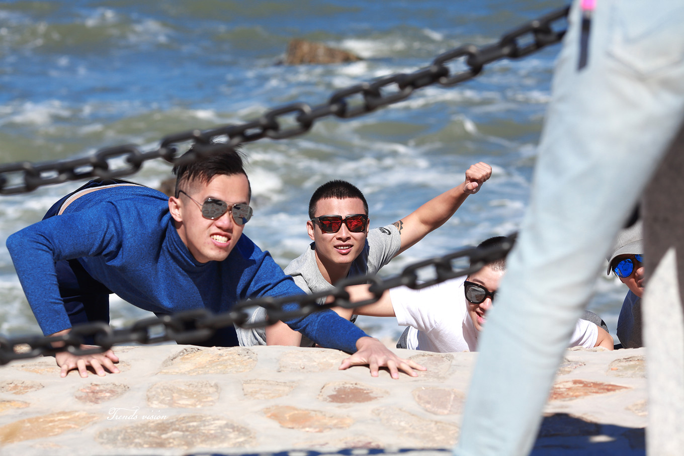 下圖 大頂山山腳下的亂石海灘上拍照的型男。可能是淡季的原因,整片的海灘景點幾乎沒有什么人,我們在這片海灘呆了很久,很少看到游客,等了好久可算等到了帥哥美女,抓住機會蹭拍了幾張照片。