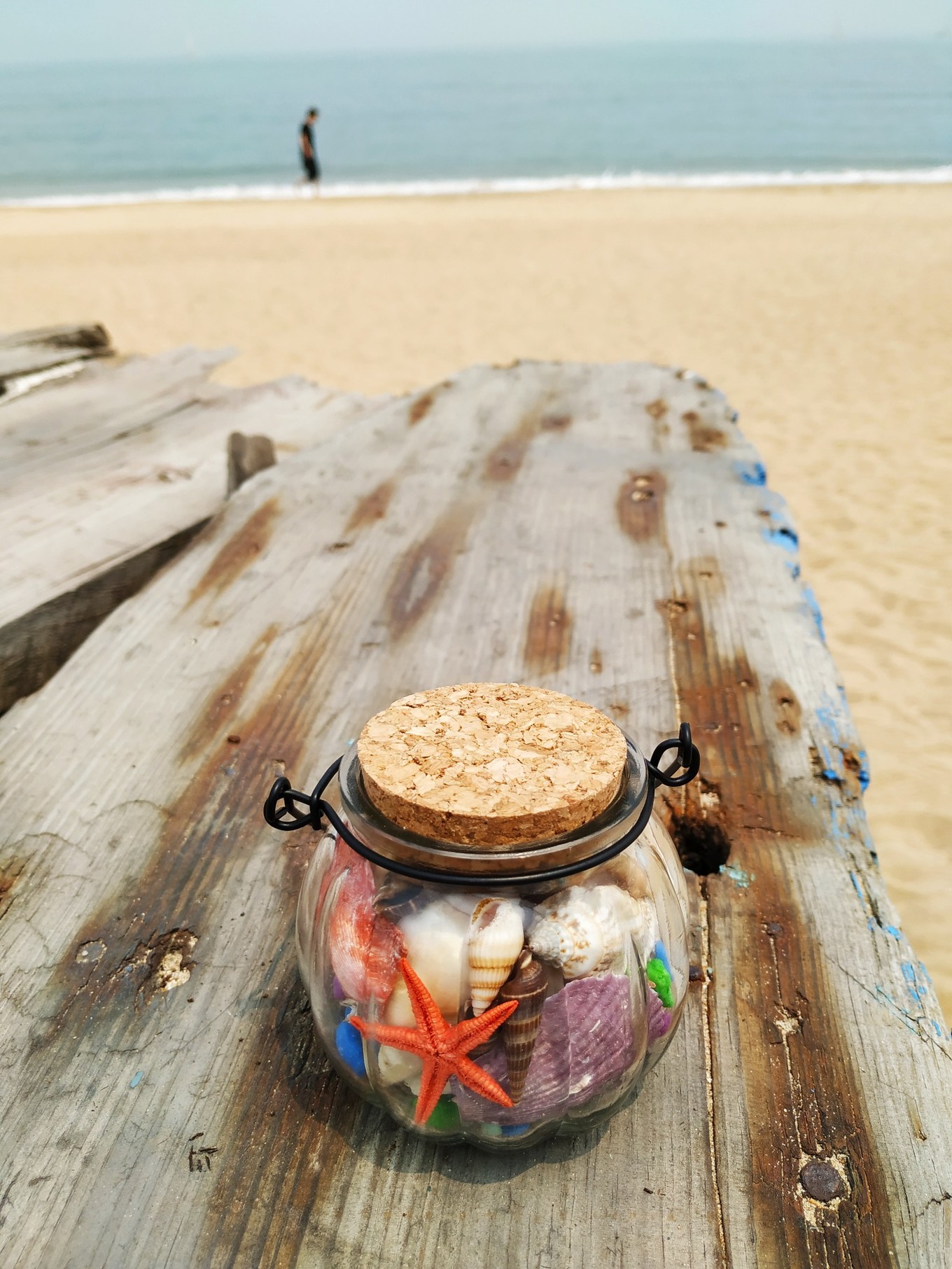上圖,海邊走道邊有小攤賣各種貝殼的,自己裝滿一個小的玻璃瓶子,15元一瓶,自己組裝,很漂亮。