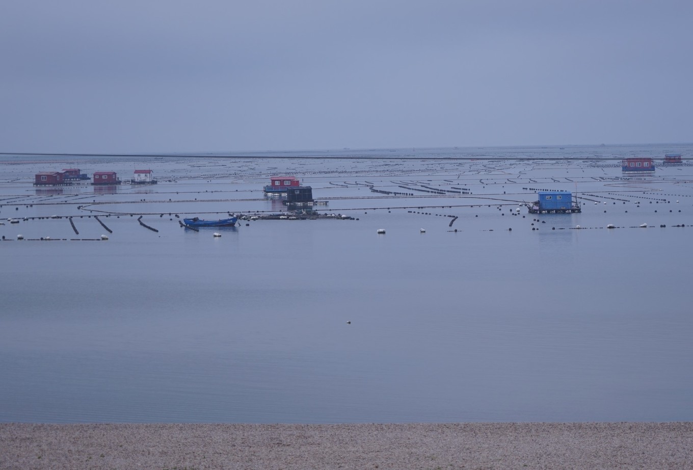 長(zhǎng)山島把一波碧水分為兩個(gè)世界,島的外海面對(duì)黃海和渤海,汪洋浩淼,為天然捕撈漁場(chǎng);島面對(duì)大陸的內(nèi)海卻風(fēng)平浪靜,為水產(chǎn)養(yǎng)殖的提供便利。圖為大片扇貝人工養(yǎng)殖場(chǎng)。