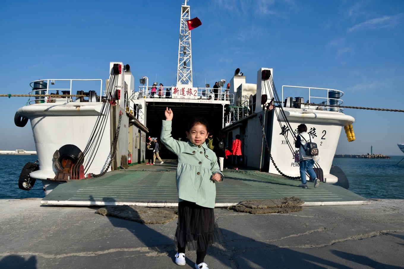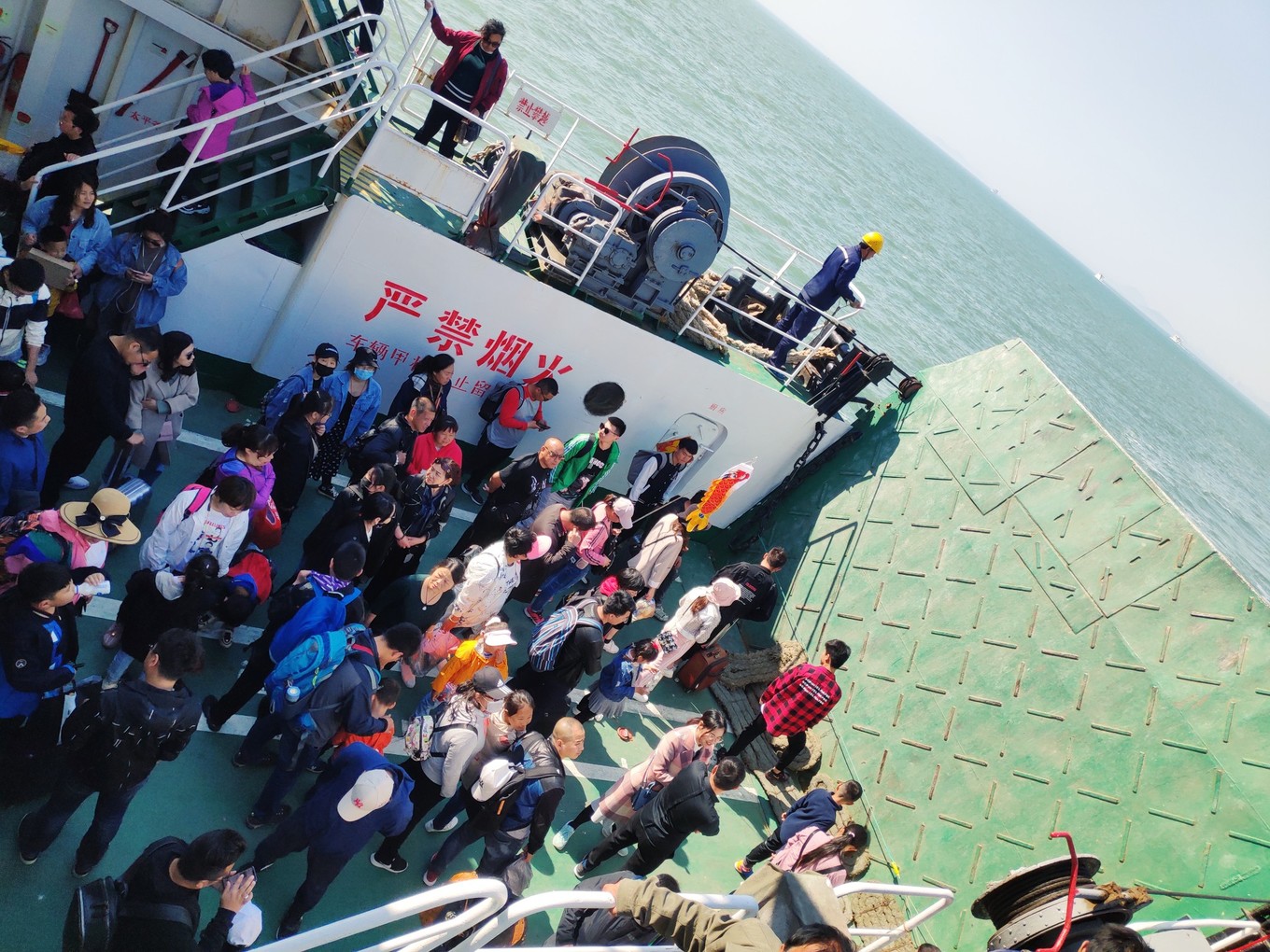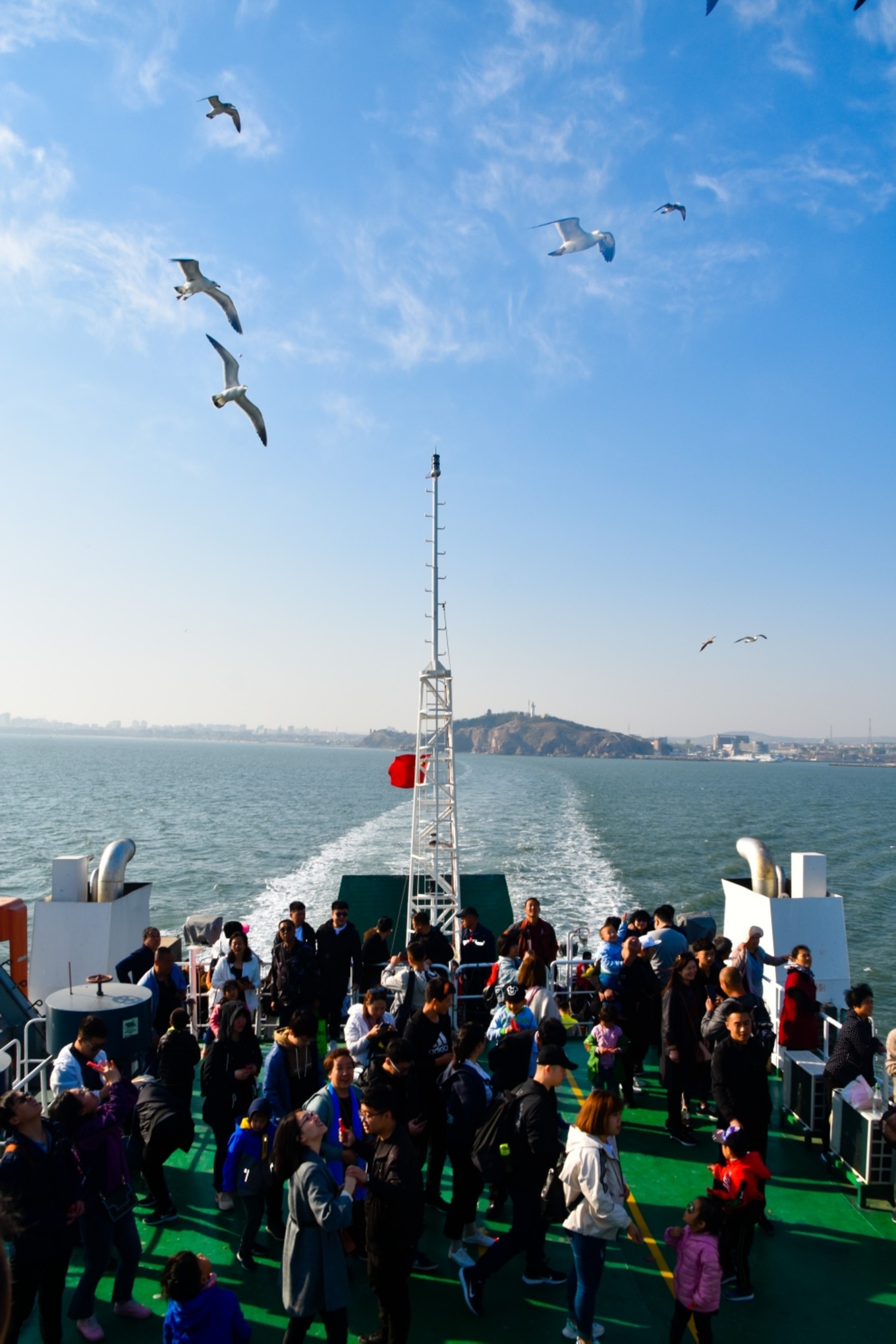 準備登船,船分三層,最下面一層用來擺渡貨車和私家轎車,第二層用來擺渡旅客,第三層可以每人加十元錢近距離喂食海鷗。而我們此行目的就是為了讓考拉體驗親近海鷗每人加了十元錢上到了三層甲板。這錢花的值??!高處的風景就是好!