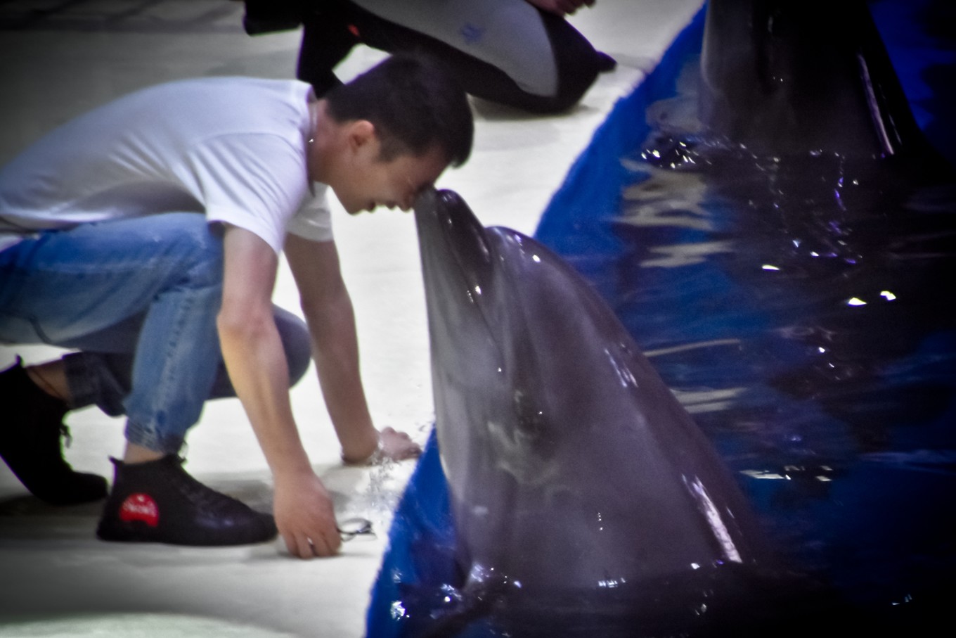 幸運的觀眾被選中和海豚親吻
