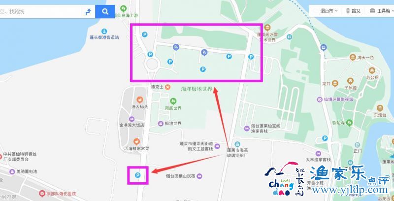 上圖指示區(qū)域?yàn)榫徒\噲?chǎng),距離長(zhǎng)島港口周邊的停車場(chǎng)旺季時(shí)停車相對(duì)緊張,可選擇稍遠(yuǎn)一些 步行到碼頭就可以。