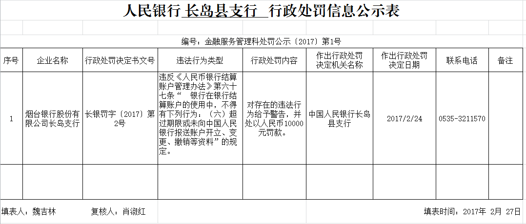 近日,中國人民銀行濟(jì)南分行發(fā)布的長銀罰字〔2017〕第2號行政處罰書顯示,煙臺銀行股份有限公司長島支行在經(jīng)營過程中,違反了《人民幣銀行結(jié)算賬戶管理辦法》第六十七條“銀行在銀行結(jié)算賬戶的使用中,不得有下列行為:(六)超過期限或未向中國人民銀行報(bào)送賬戶開立、變更、撤銷等資料”的規(guī)定。中國人民銀行長島縣支行決定對煙臺銀行股份有限公司長島支行給予警告,并處以1萬元罰款。作出行政處罰的決定日期為2017年2月24日。